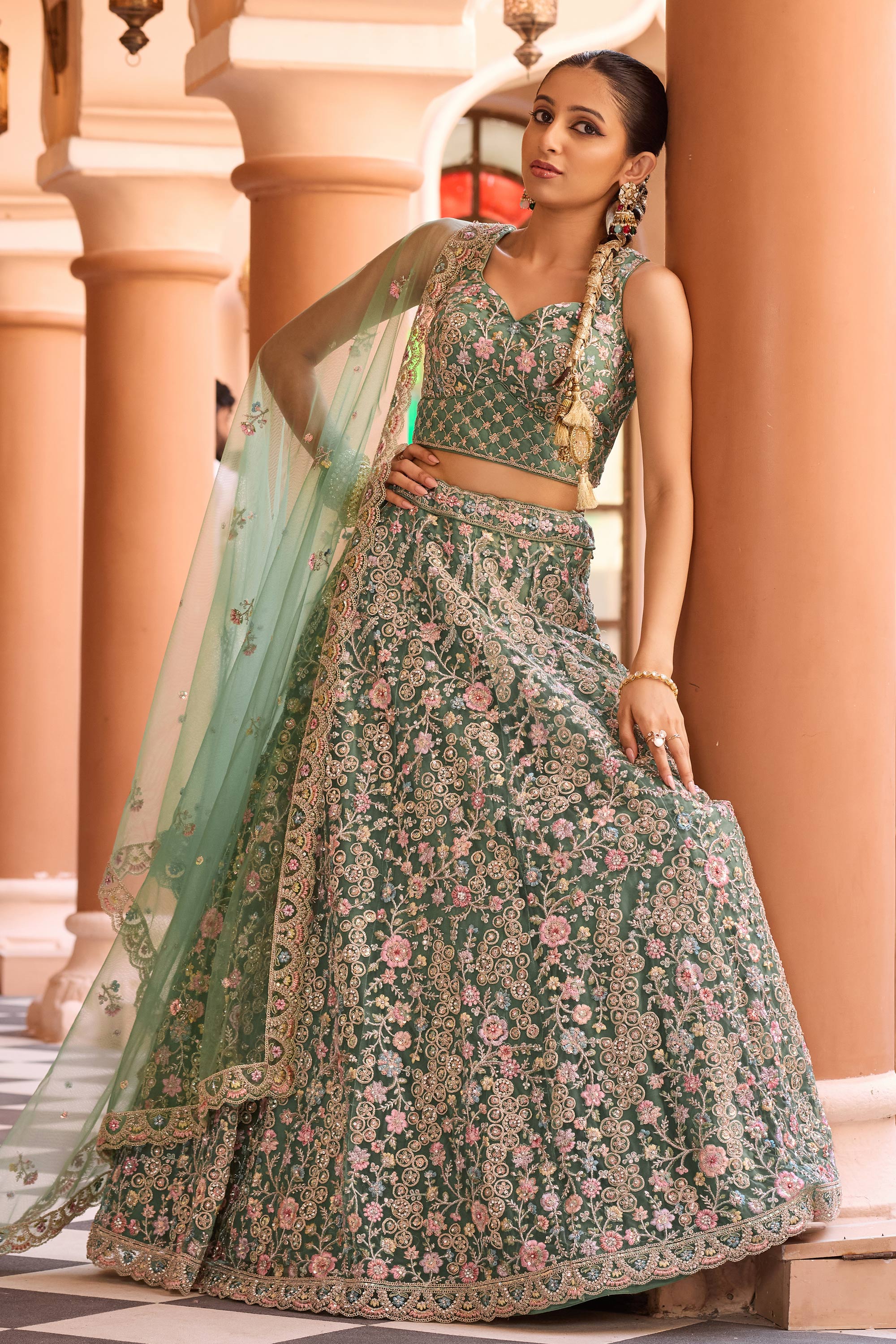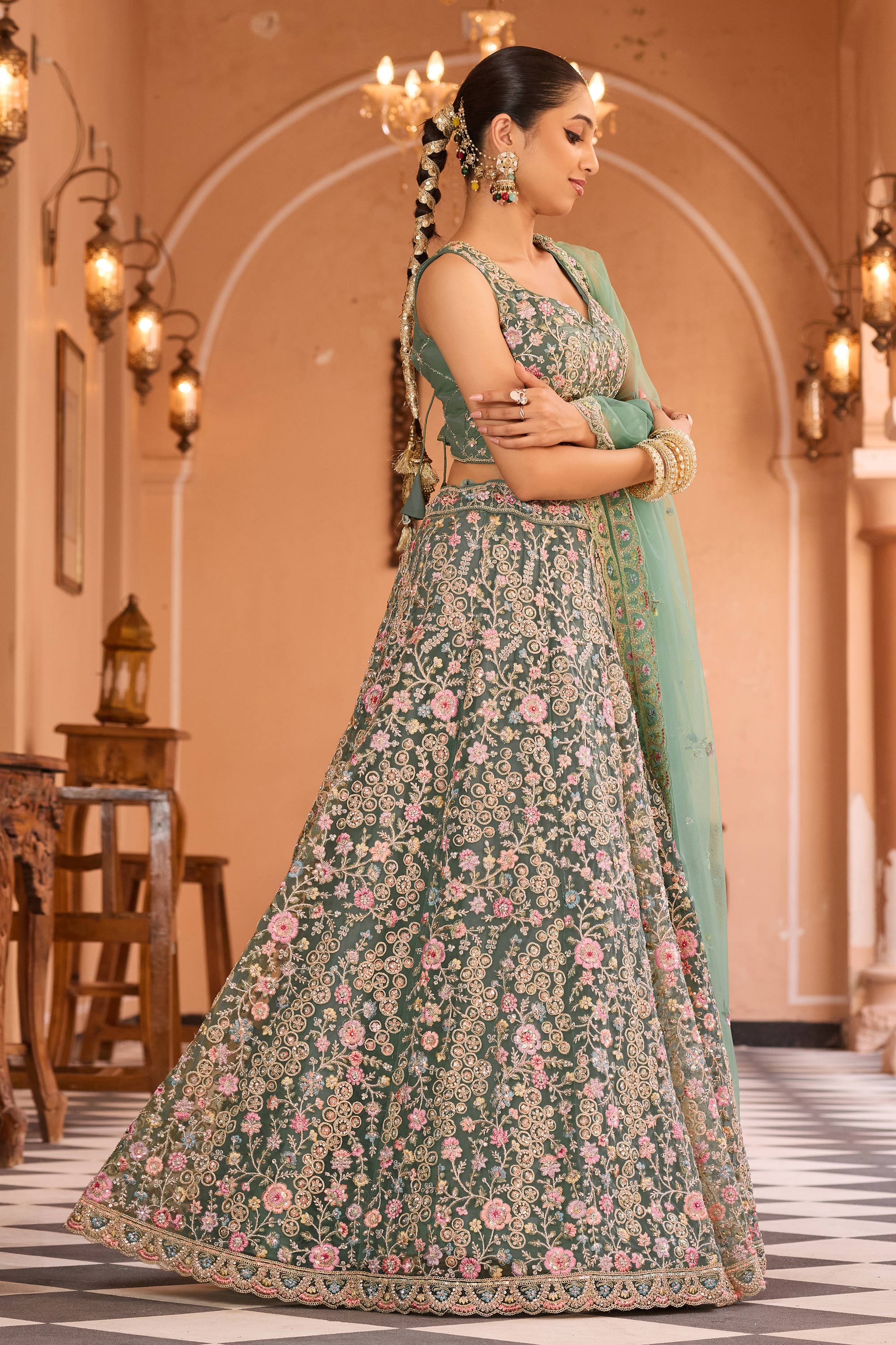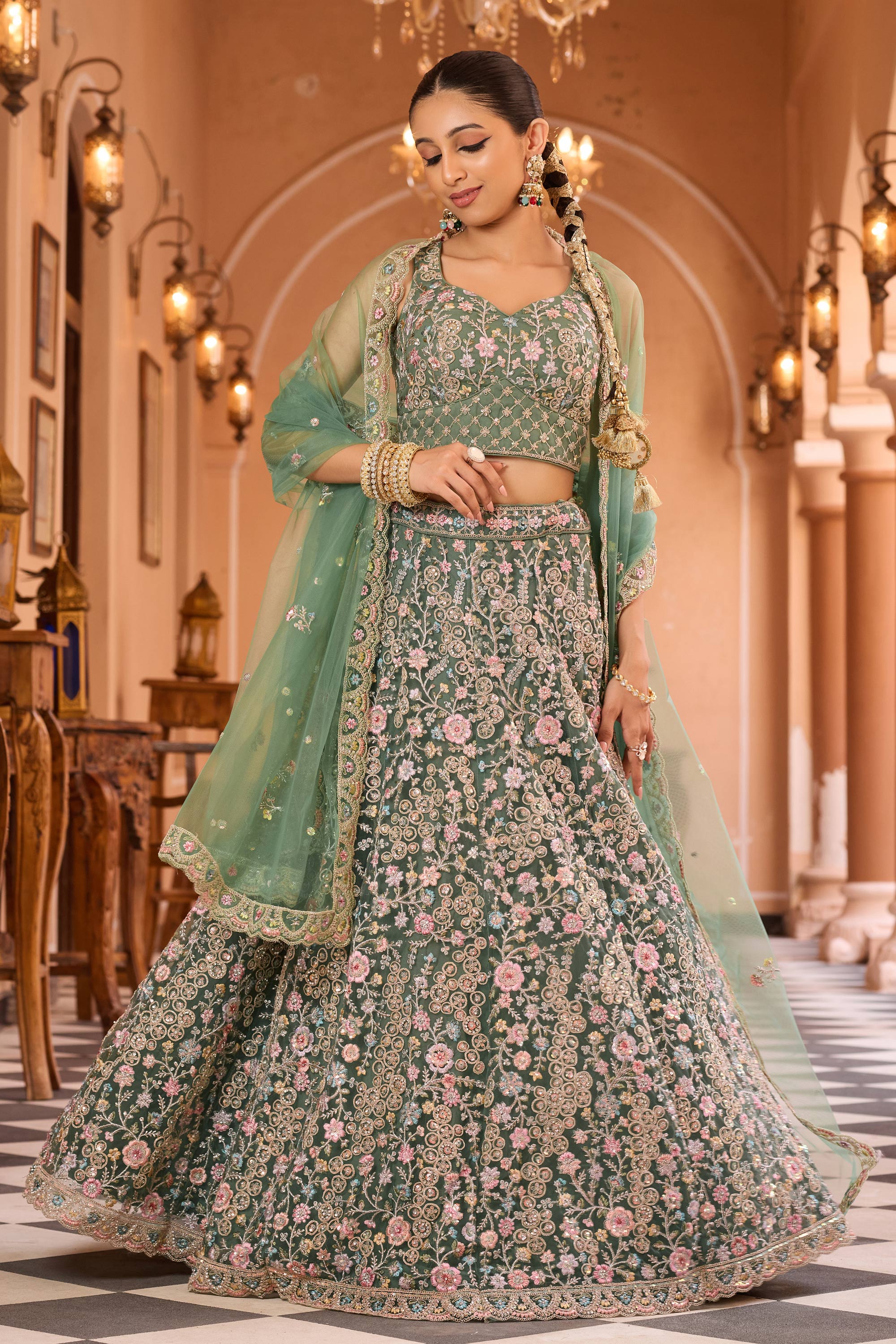 Embroidered Net Fabric Sea Green Lehenga Choli For Wedding Wear