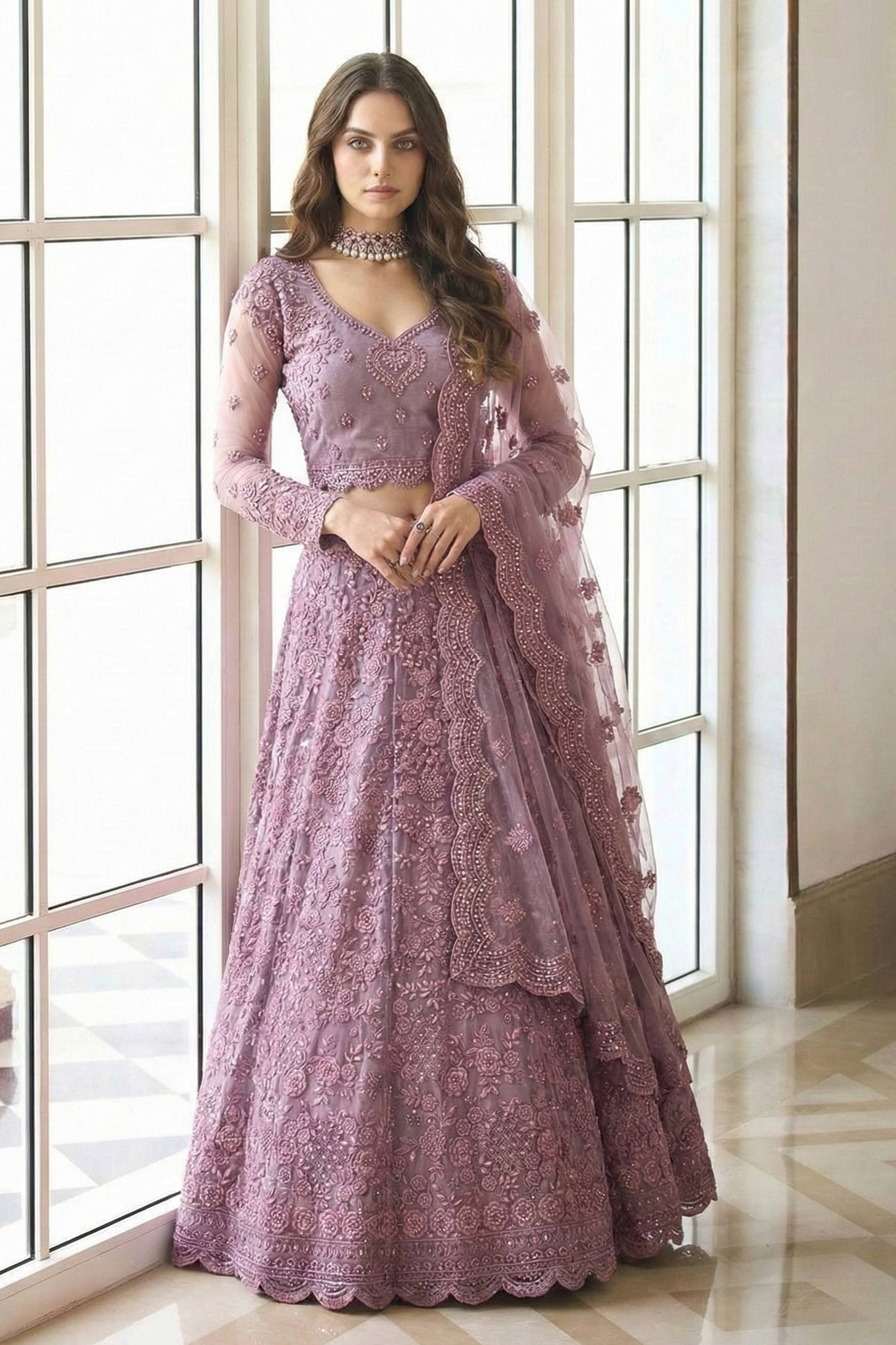 Embroidered Net Purple Lehenga Choli For Wedding Wear