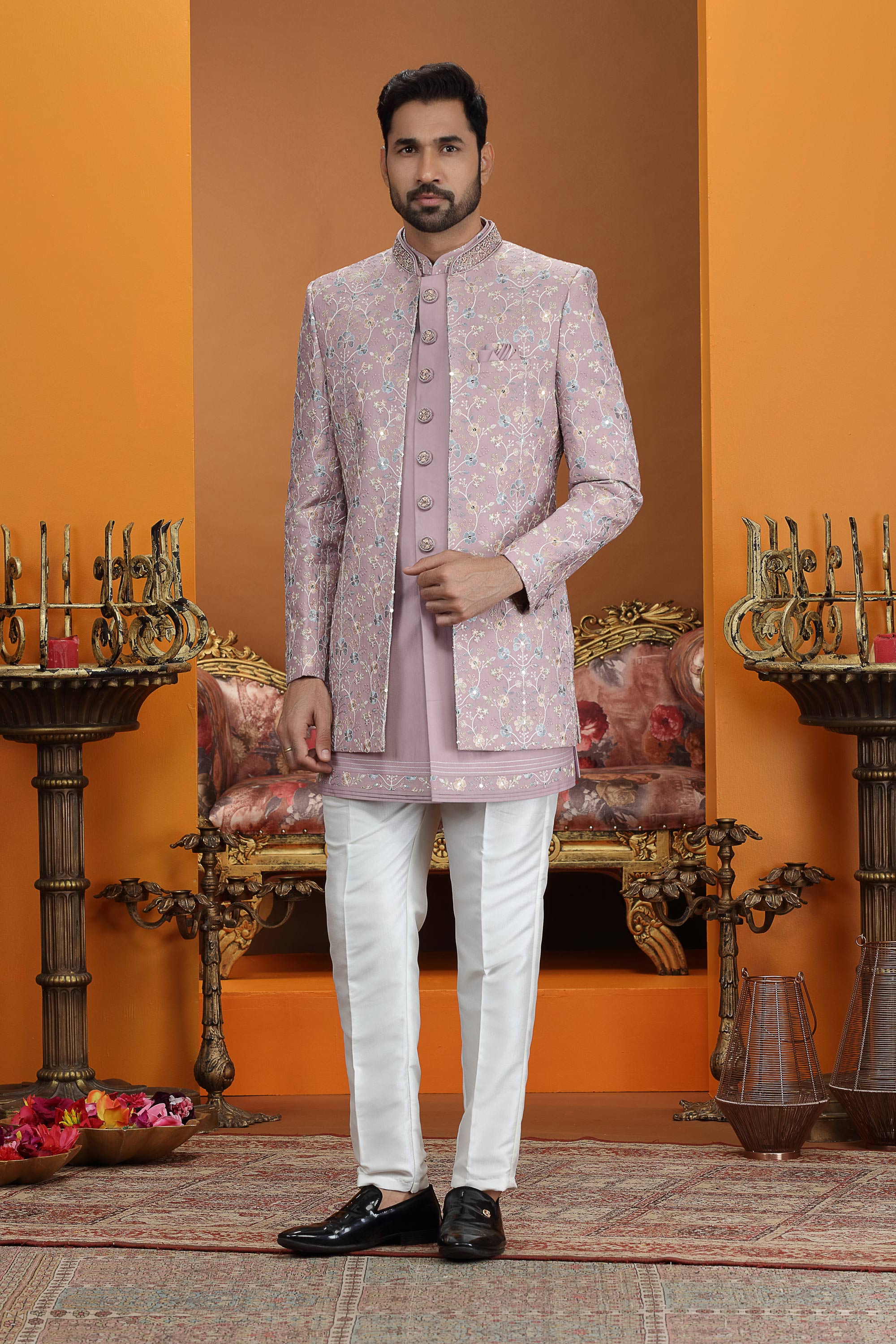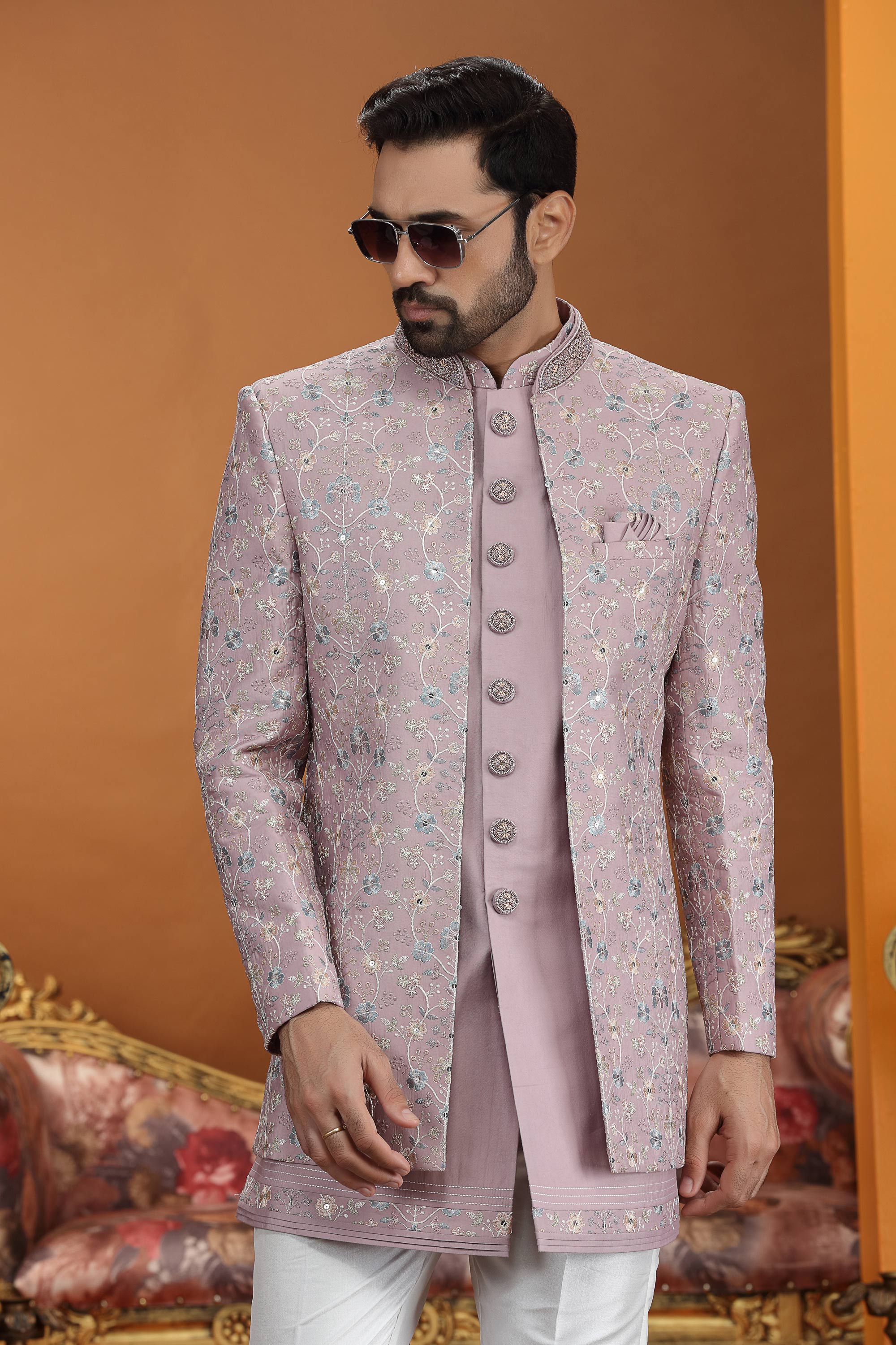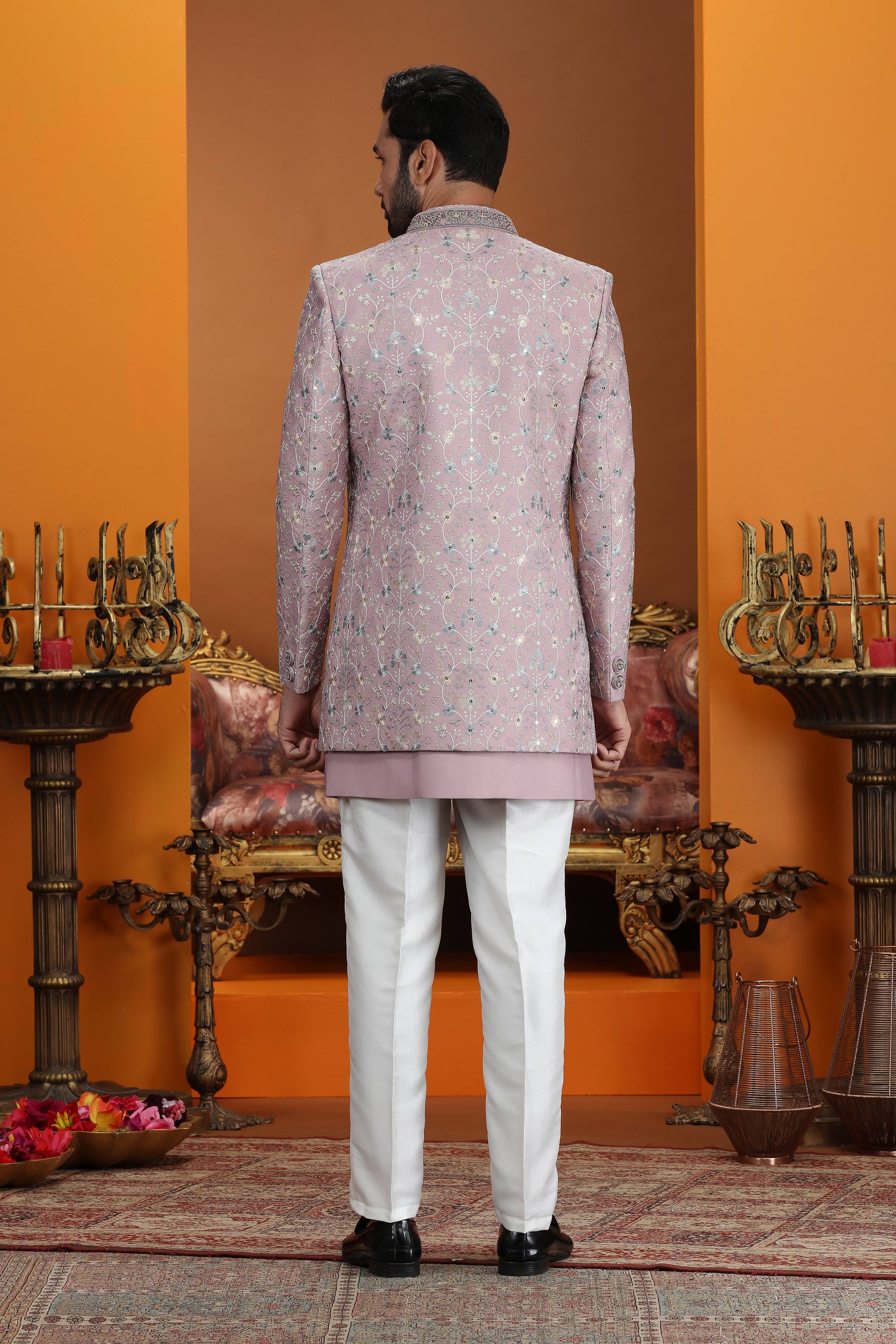 Embroidered Pink Wedding Wear 3 Piece Indo Western For Men