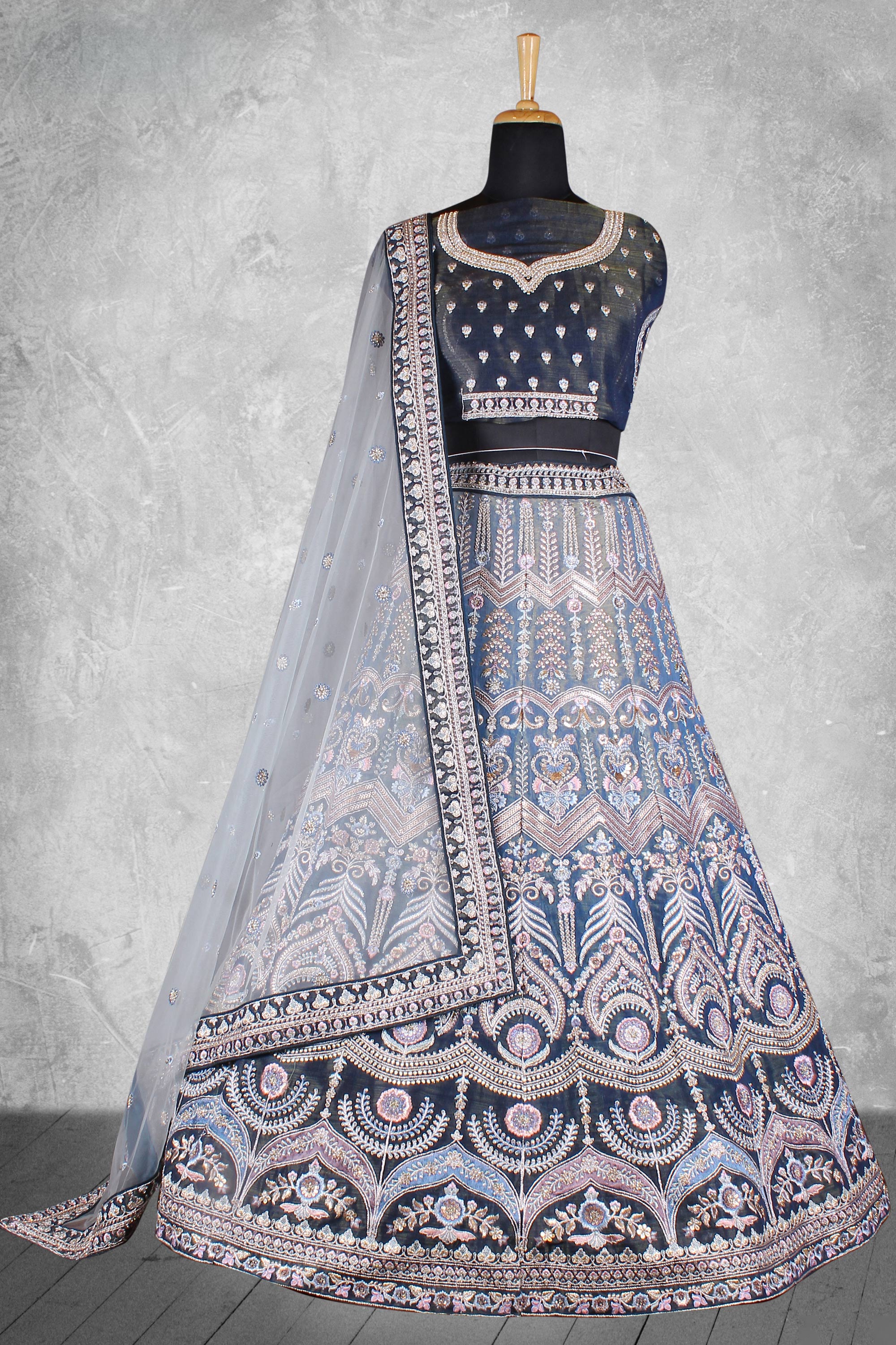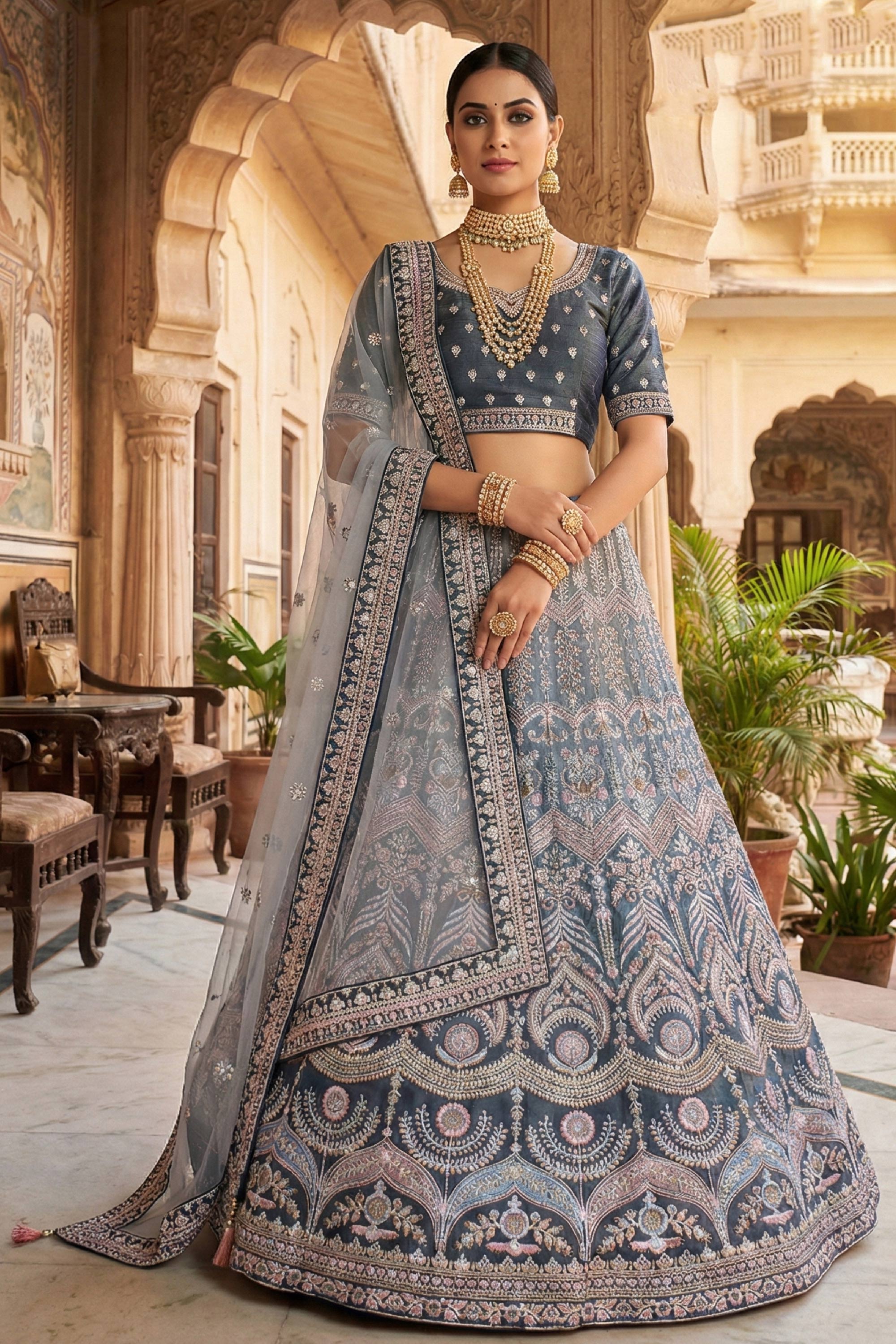 Celebrate your wedding in true royal style with this exquisitely crafted Bridal Lehenga. The rich velvet lehenga is adorned with heavy embroidery, showcasing fine craftsmanship and luxurious appeal. Note: Due to digital photography, slight color variations may occur.