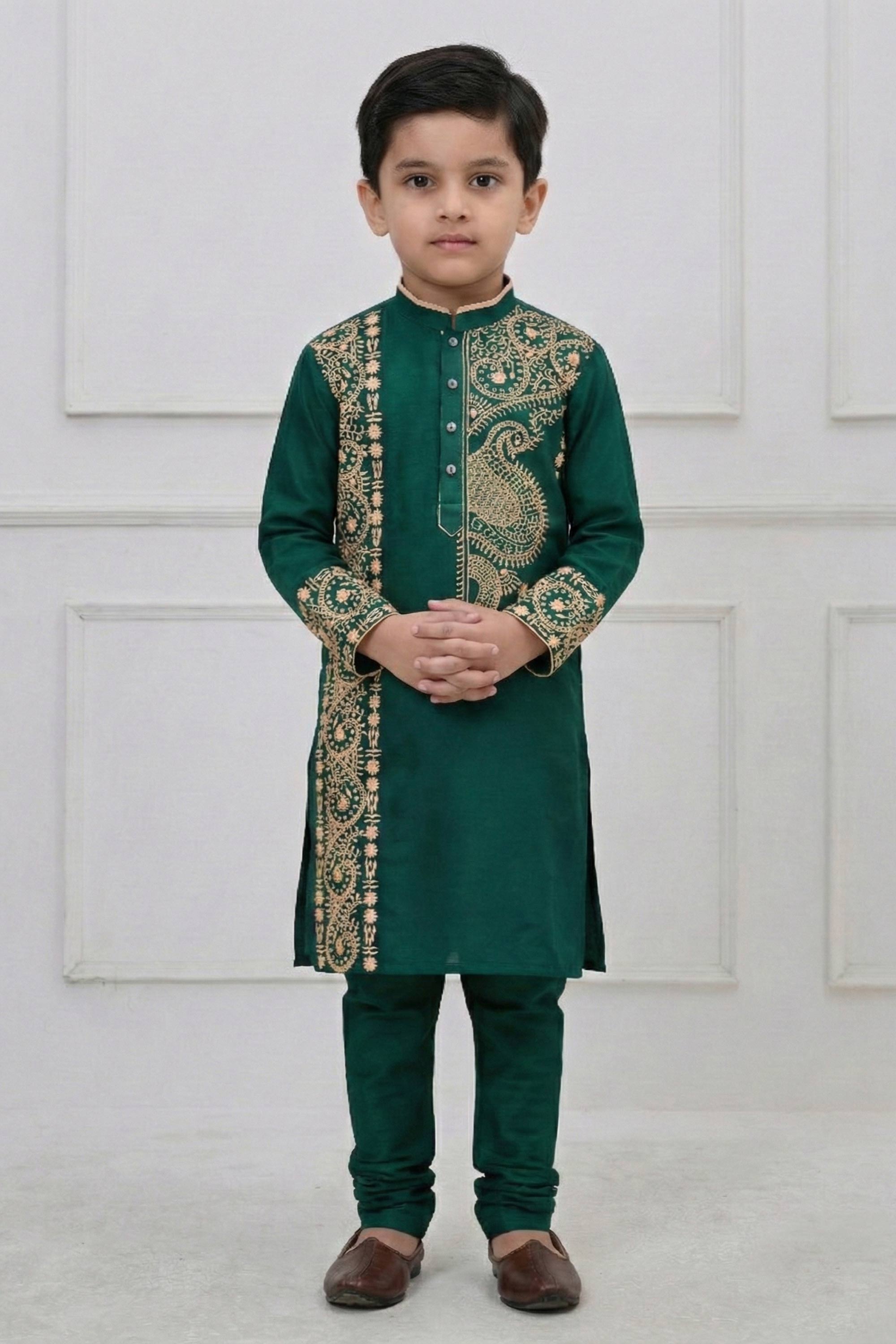Embroidered Viscose Dark Green Sangeet Wear Readymade Kurta Pyjama For Boys