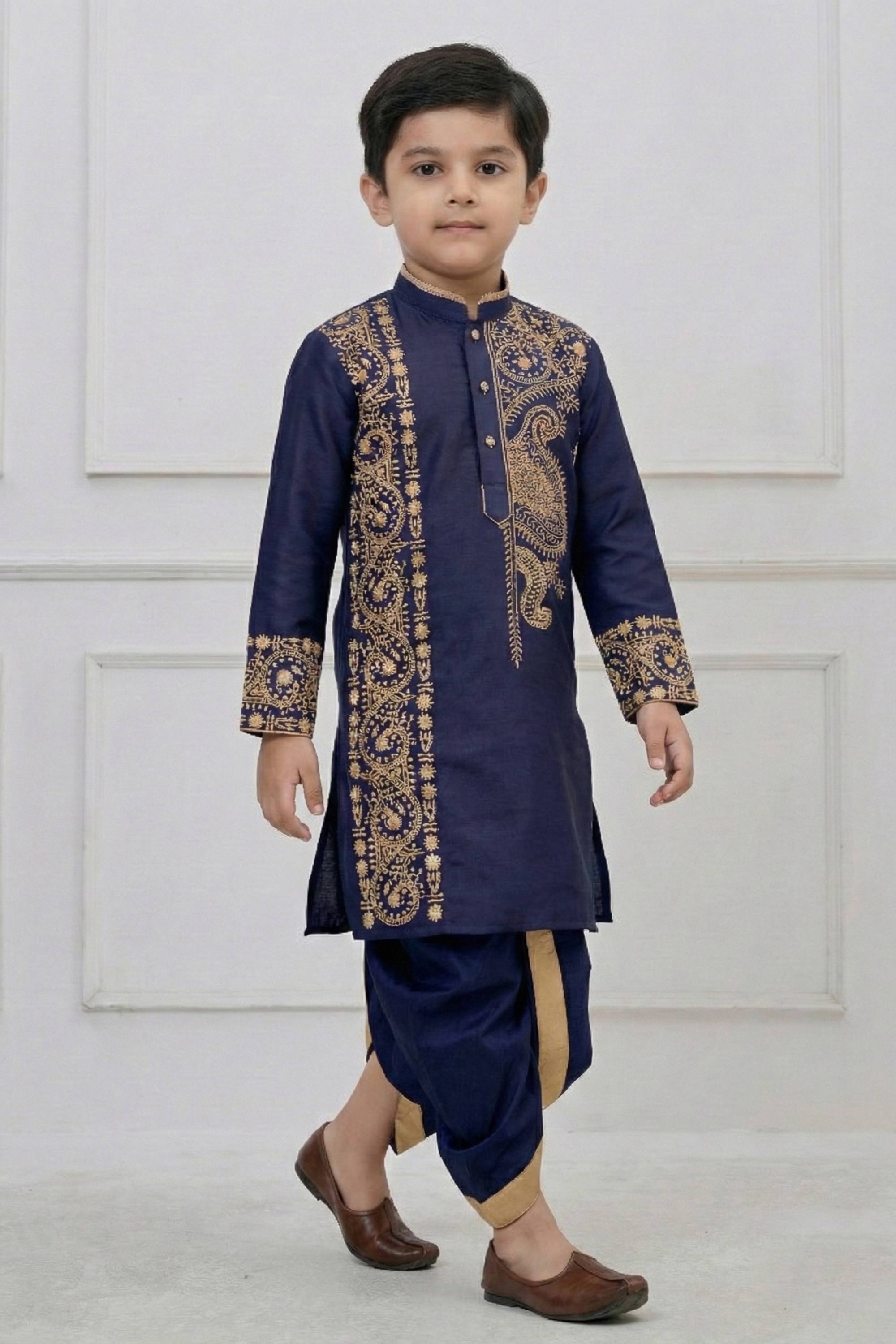 Embroidered Viscose Navy Blue Boys Readymade Kurta With Dhoti For Festive Wear