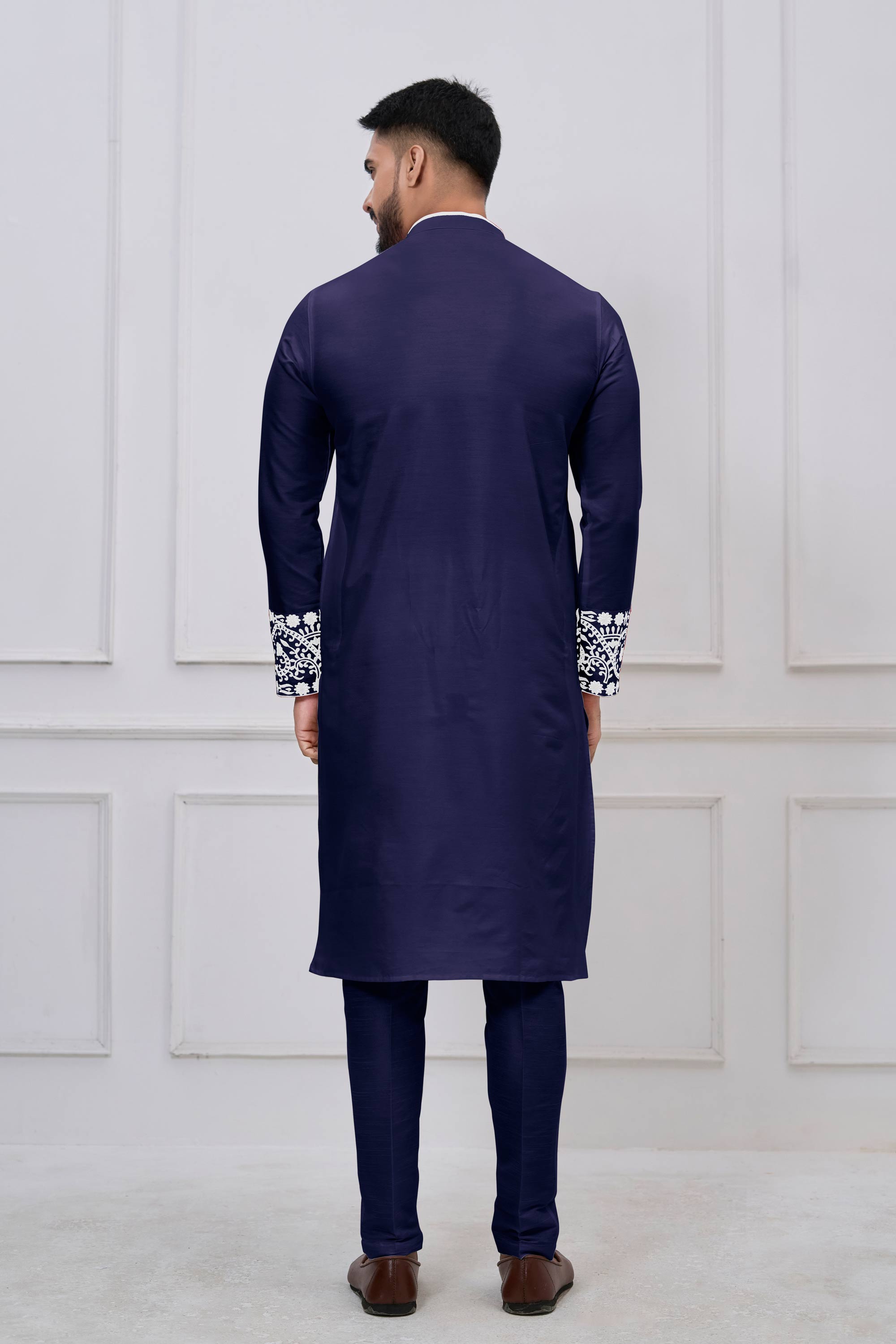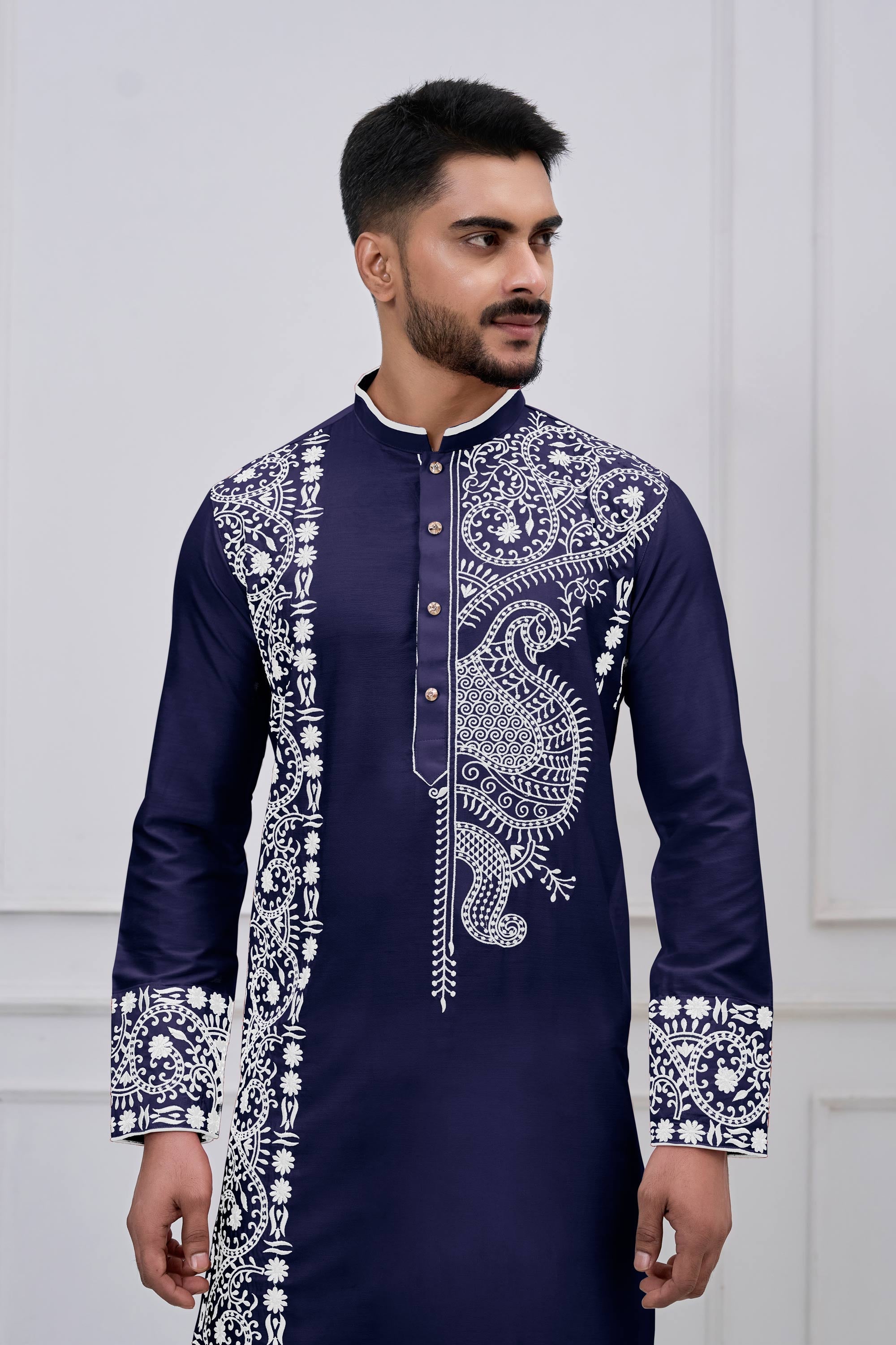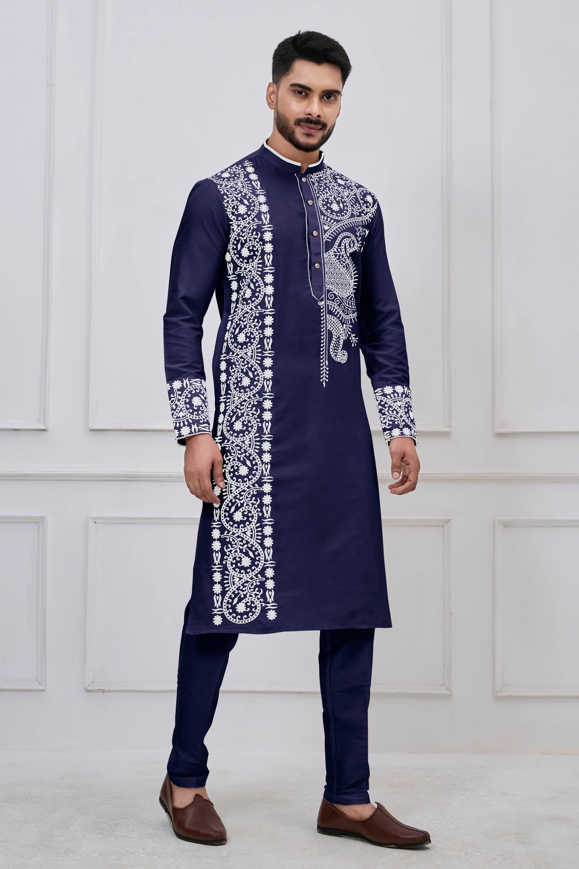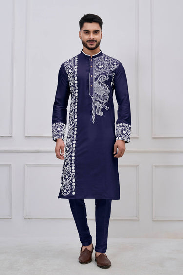 Embroidered Viscose Navy Blue Men Readymade Kurta Pyjama For Festive Wear
