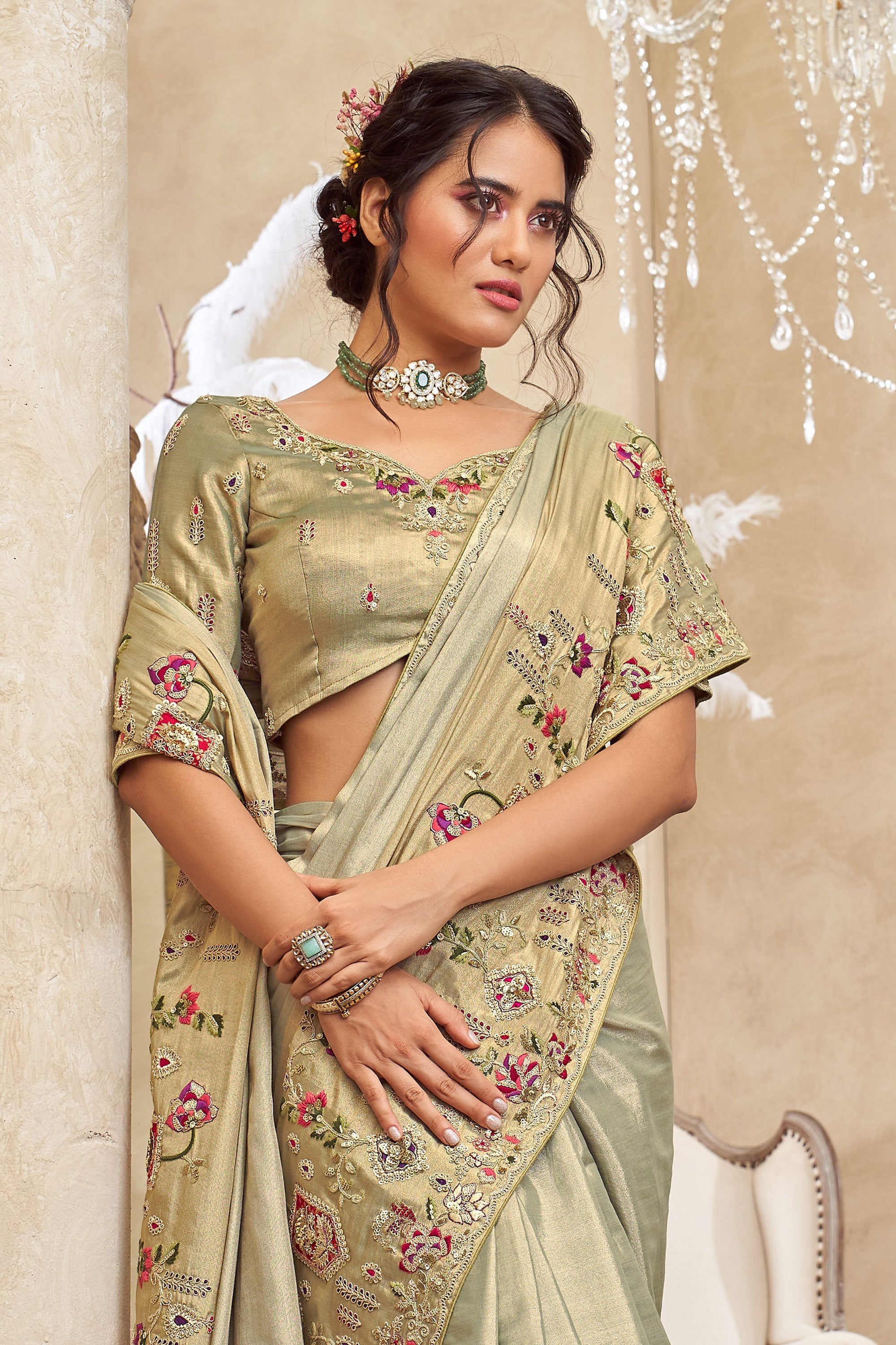 Embroidered Viscose Silk Cream Saree For Wedding Wear