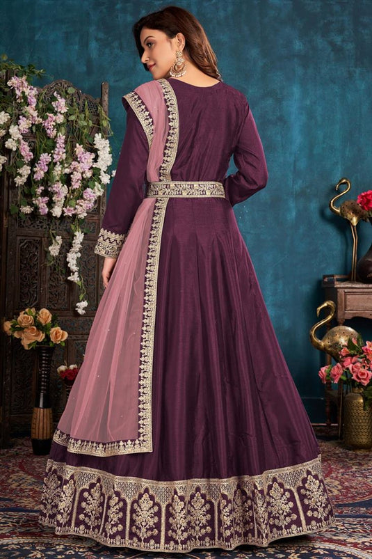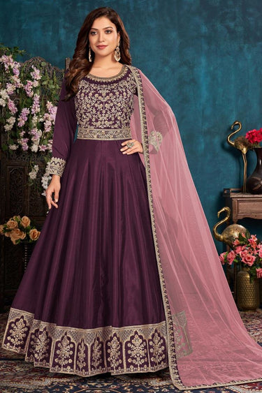 Embroidered Work Art Sirk Fabric Sangeet Wear Purple Color Anarkali Suit