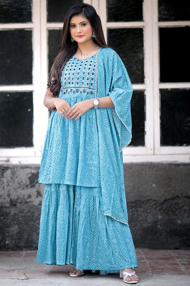 Embroidered Work Cotton Fabric Designer Casual Wear Readymade Palazzo Suit In Sky Blue Color