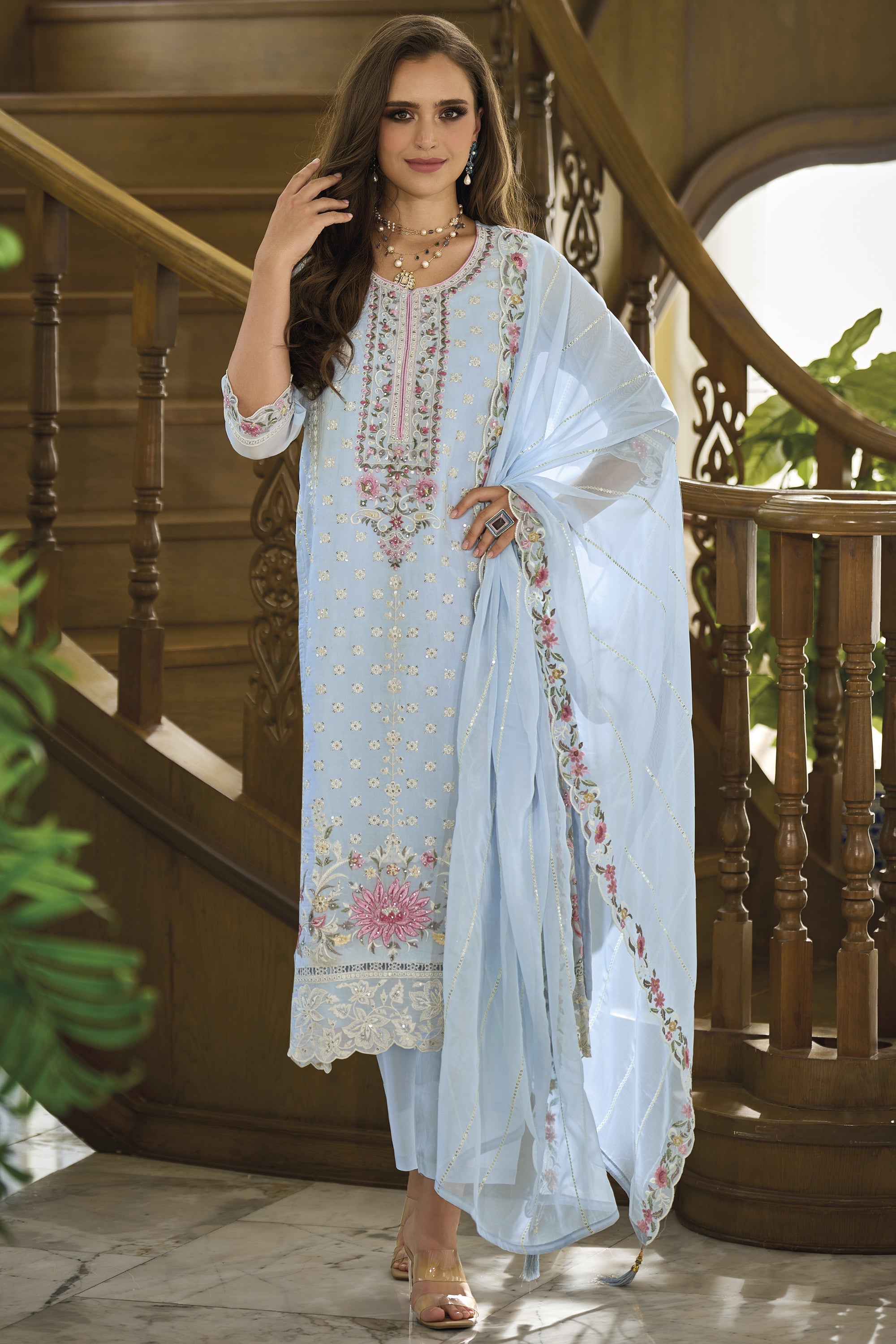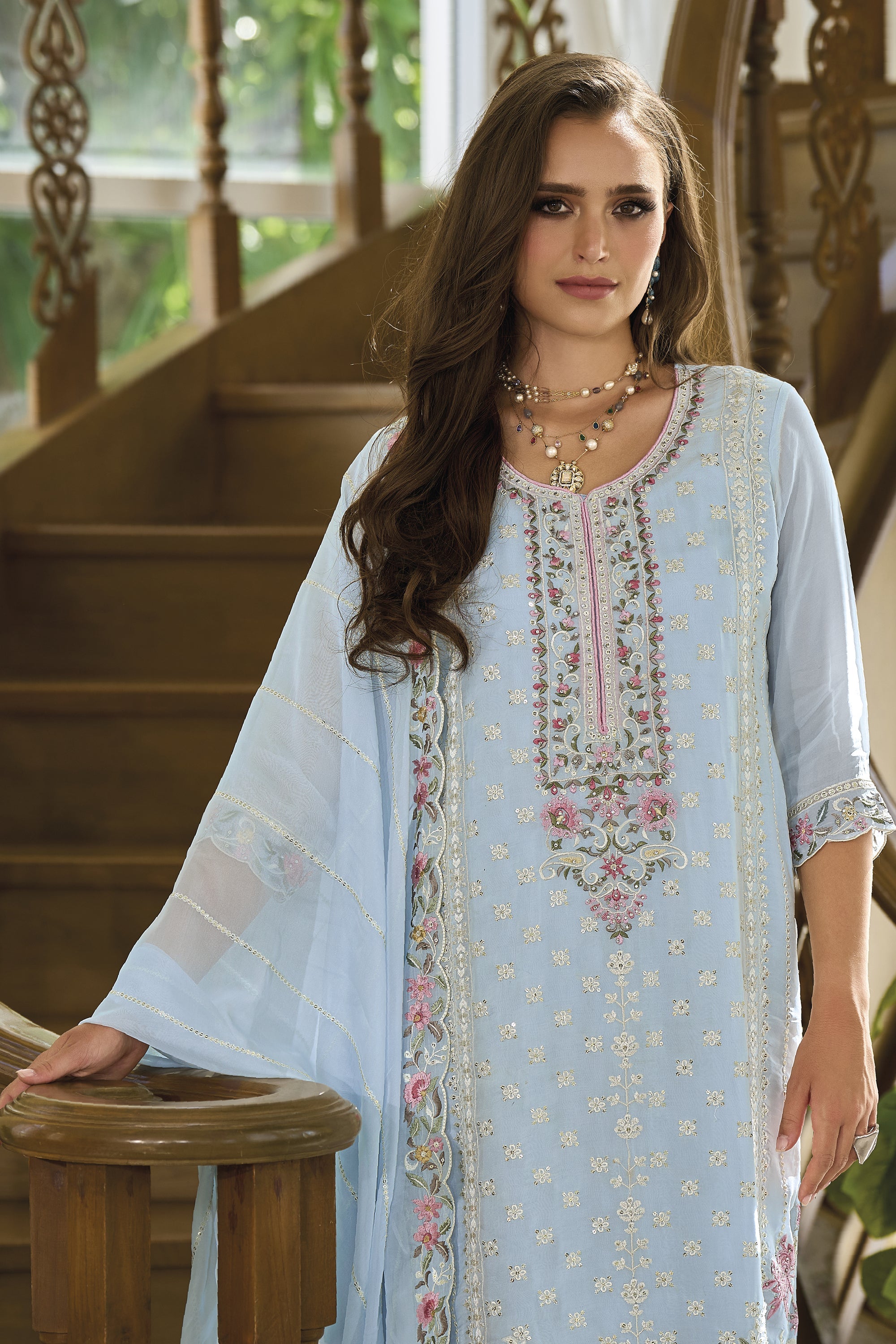 Embroidered Work On Light Cyan Color Aristocratic Organza Fabric Readymade Salwar Suit