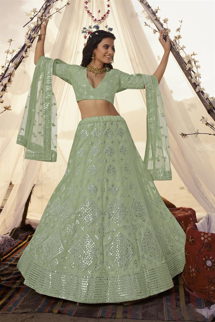 Embroidered Work On Sea Green Color Sangeet Wear Phenomenal Lehenga In Organza Fabric