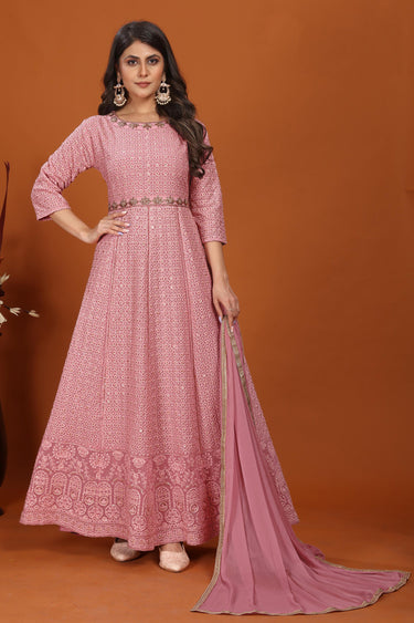 Embroidered Work Pink Color Fashionable Gown With Dupatta In Georgette Fabric