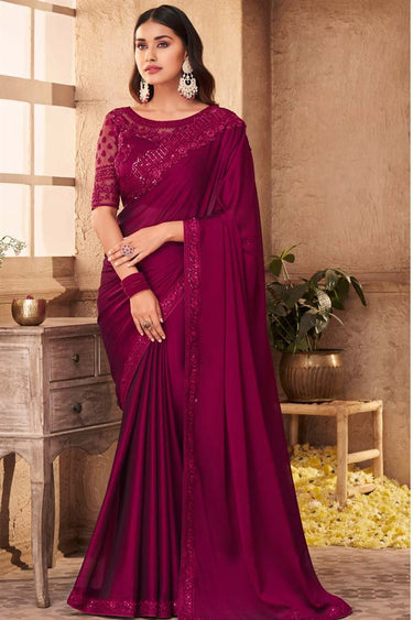 Embroidered Work Wine Color Georgette Fabric Supreme Party Wear Saree