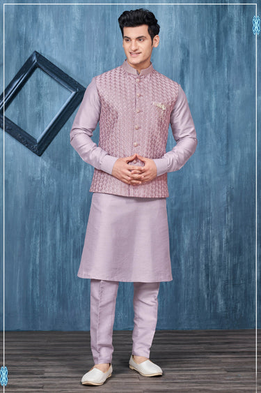Embroidery Work Lavender Banarasi Silk Graceful Readymade Men Kurta Pyjama With Jacket