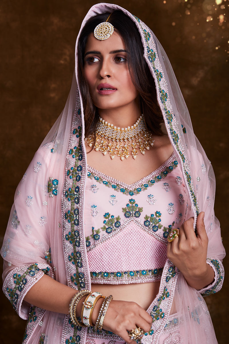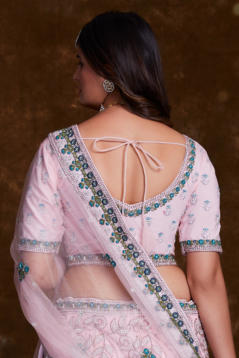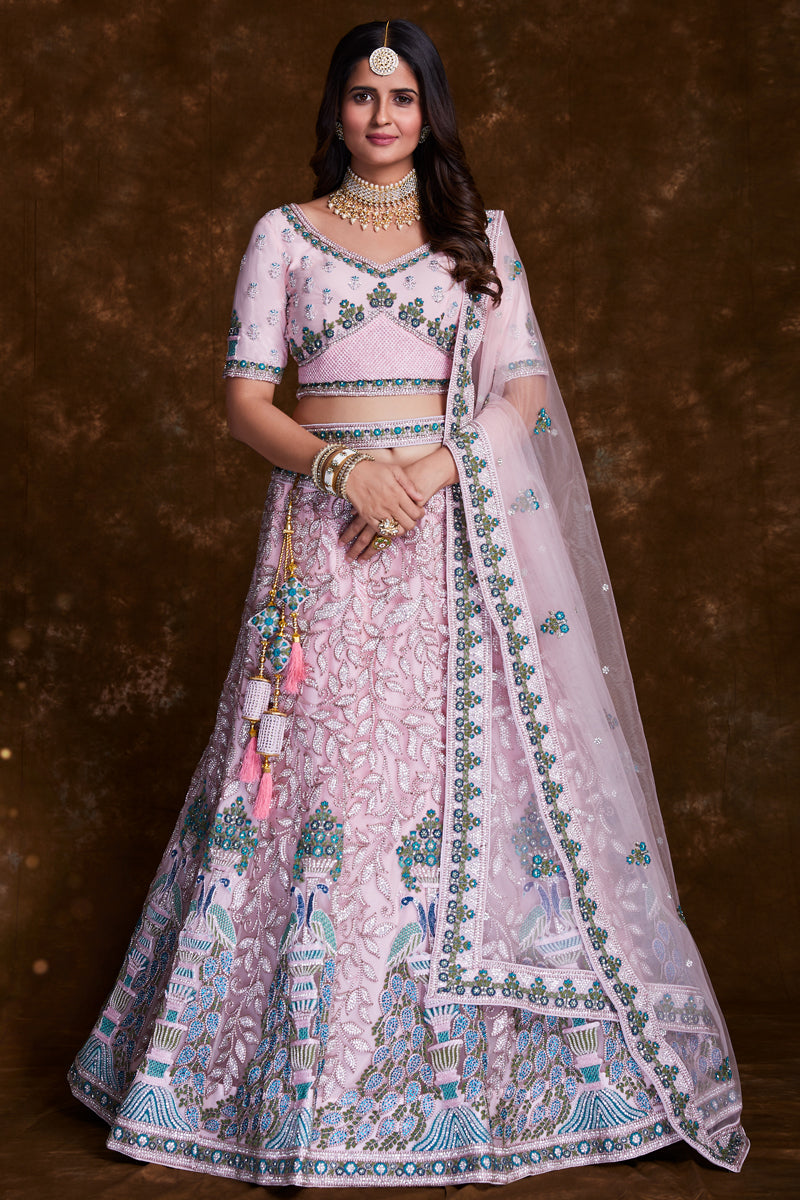 Embroidery Work On Net Designer Lehenga In Pink With Blouse