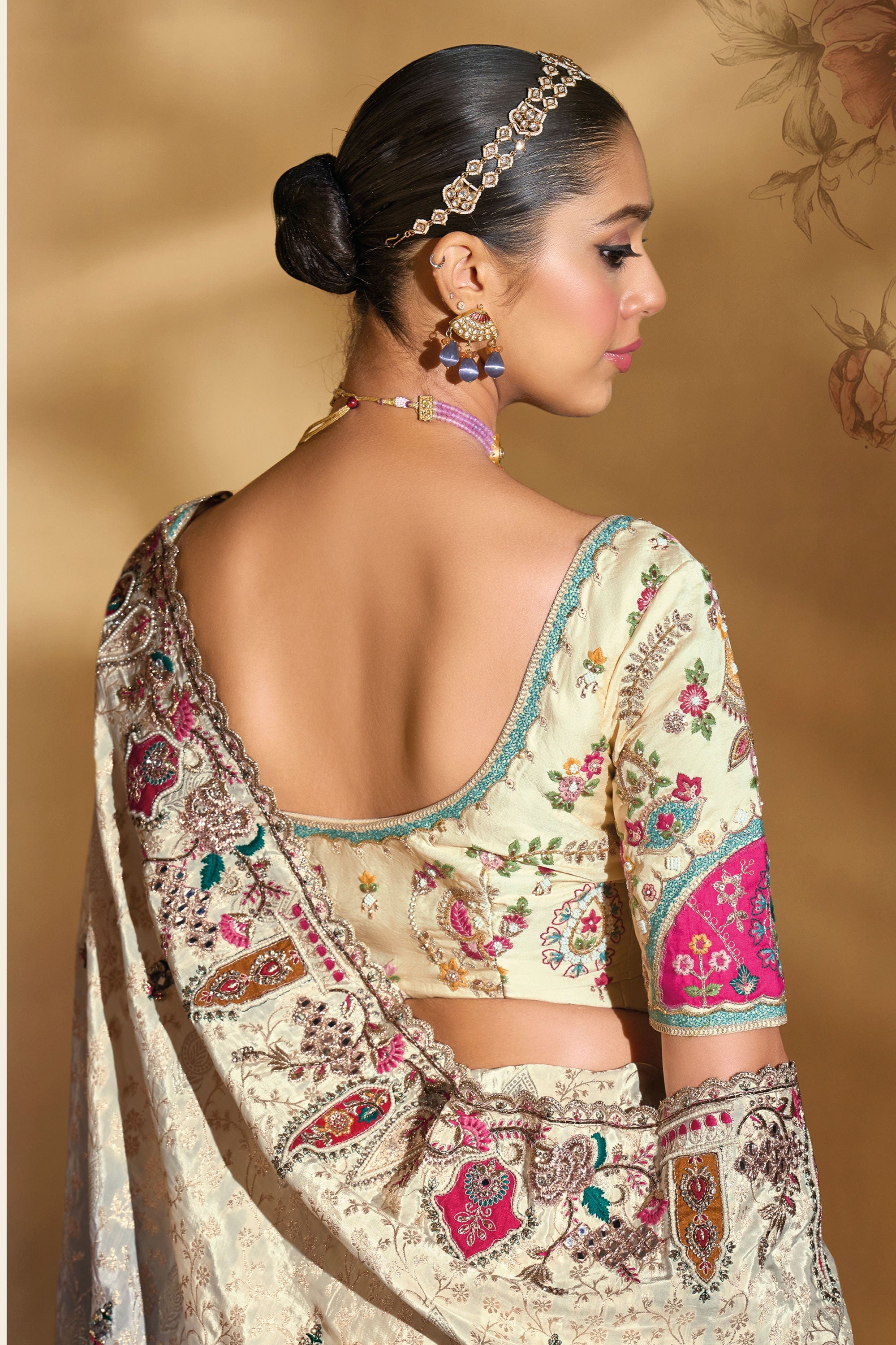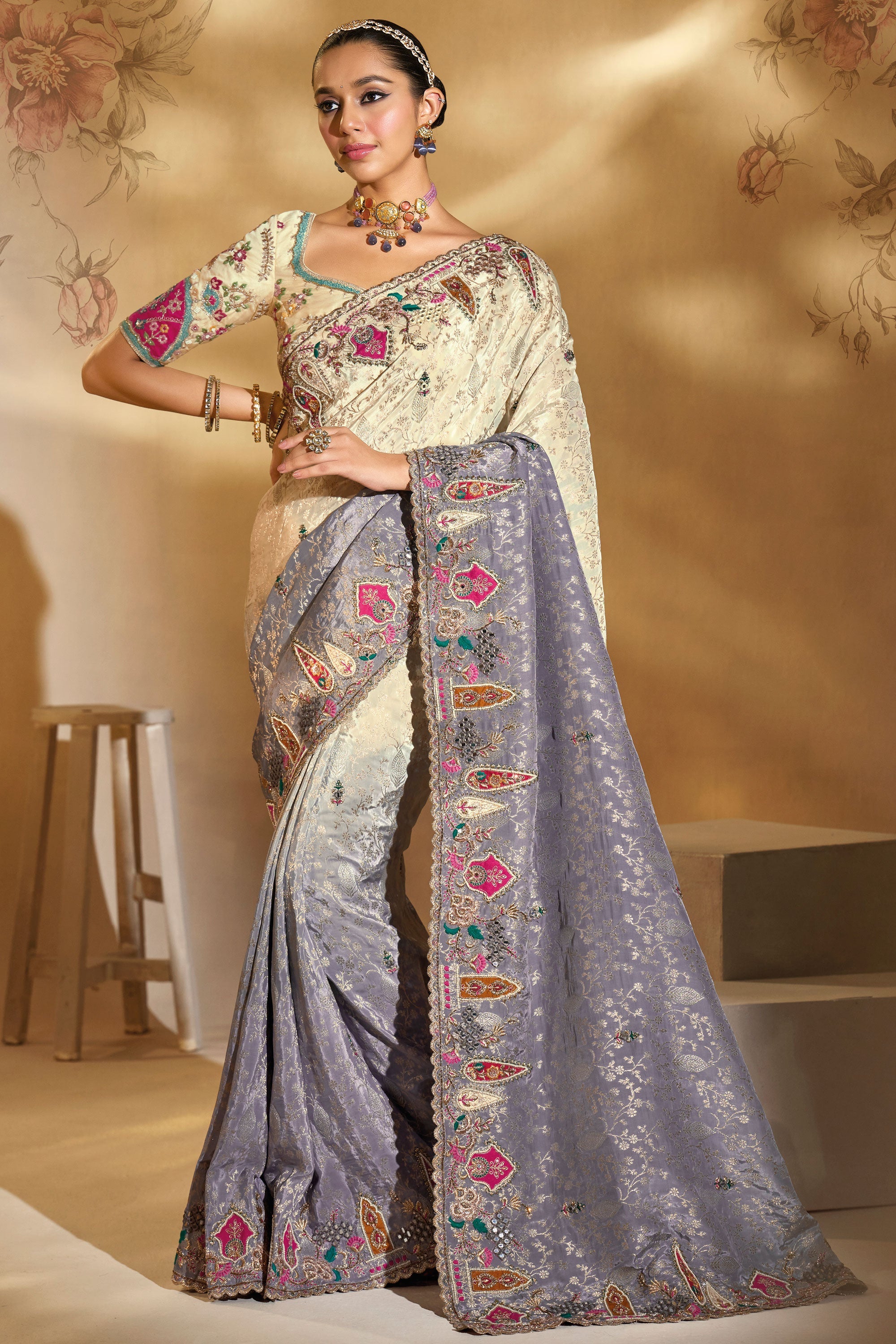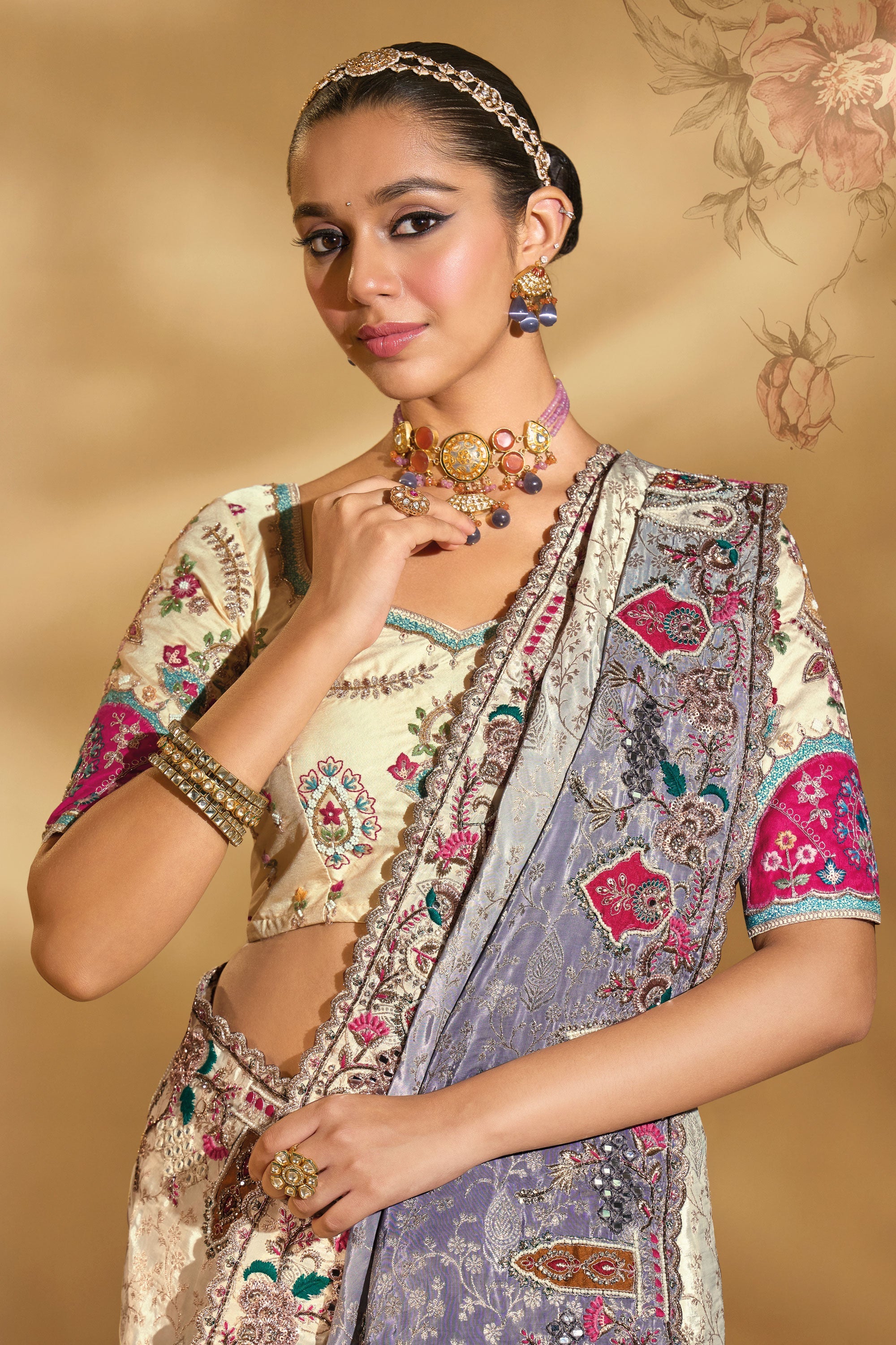 Engaging Beige Color Crepe Fabric Heavy Embroidered Saree