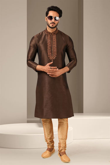Engaging Brown Color Banarasi Art Silk Fabric Festive Wear Readymade Kurta Pyjama For Men