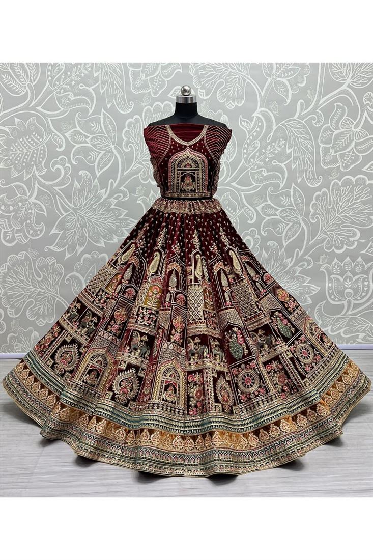 Engaging Maroon Color Velvet Fabric Bridal Lehenga For Wedding