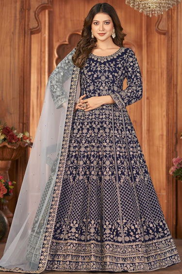 Engaging Navy Blue Color Velvet Fabric Anarkali Suit In Function Wear