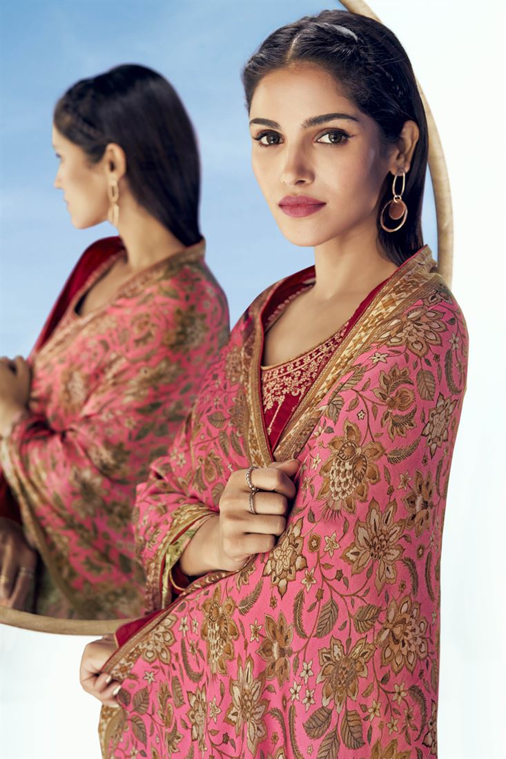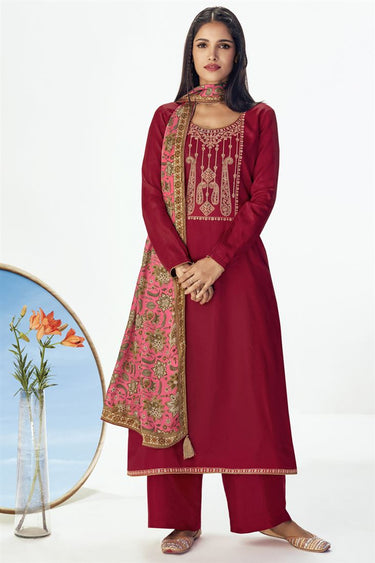 Engaging Vartika Singh Maroon Color Embroidered Art Silk Fabric Festive Wear Palazzo Salwar Suit