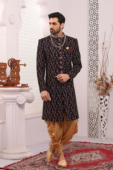 Engaging Wine Color Velvet Fabric Embroidered Work Wedding Function Readymade Designer Indo Western For Men