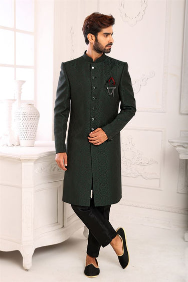 Enriching Dark Green Color Brocade Fabric Indo Western For Men