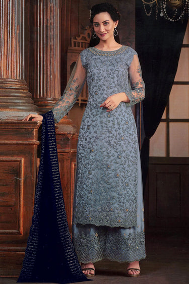 Excellent Net Fabric Sky Blue Color Embroidered Palazzo Suit