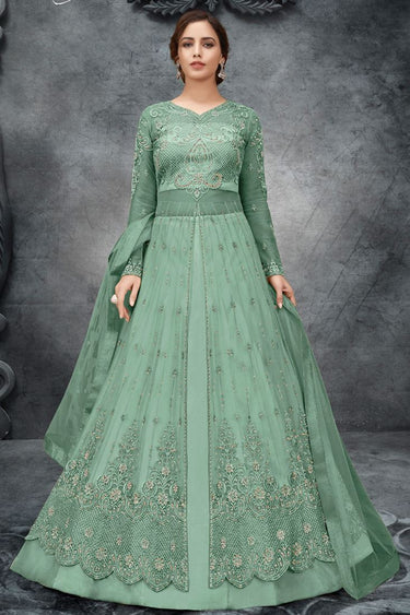 Excellent Satin Fabric Sea Green Color Embroidered Anarkali Suit