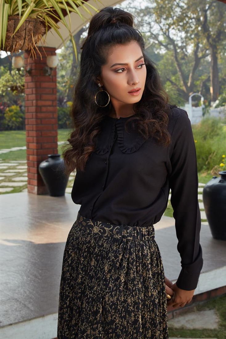 Exclusive Black Color Fancy Fabric Party Wear Indo Western Top And Printed Skirt
