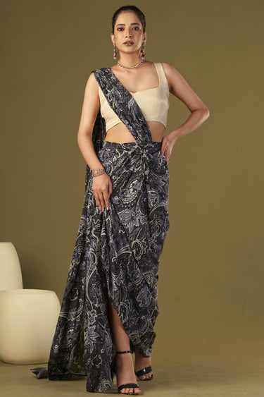Introducing the Exclusive Black Color Viscose Crepe Fabric Embroidered Work Party Wear Designer Readymade Pre Draped Saree - a stunning and sophisticated choice for any special occasion. This saree comes in a gorgeous black paisley print and is made from natural crepe, paired with an ivory tissue silk blouse featuring a knot detail at the back for added elegance. The embroidery work adds a touch of glamour to this beautiful piece, making it perfect for weddings, parties or other formal events. It's readymade so you don't have to worry about draping it yourself and can enjoy your time looking great! This saree will make heads turn and ensure you stand out from the crowd, thanks to its intricate design and premium quality materials used. Whether you're attending a traditional wedding or simply want to look chic and stylish at an event, this designer pre-draped saree is sure to impress.