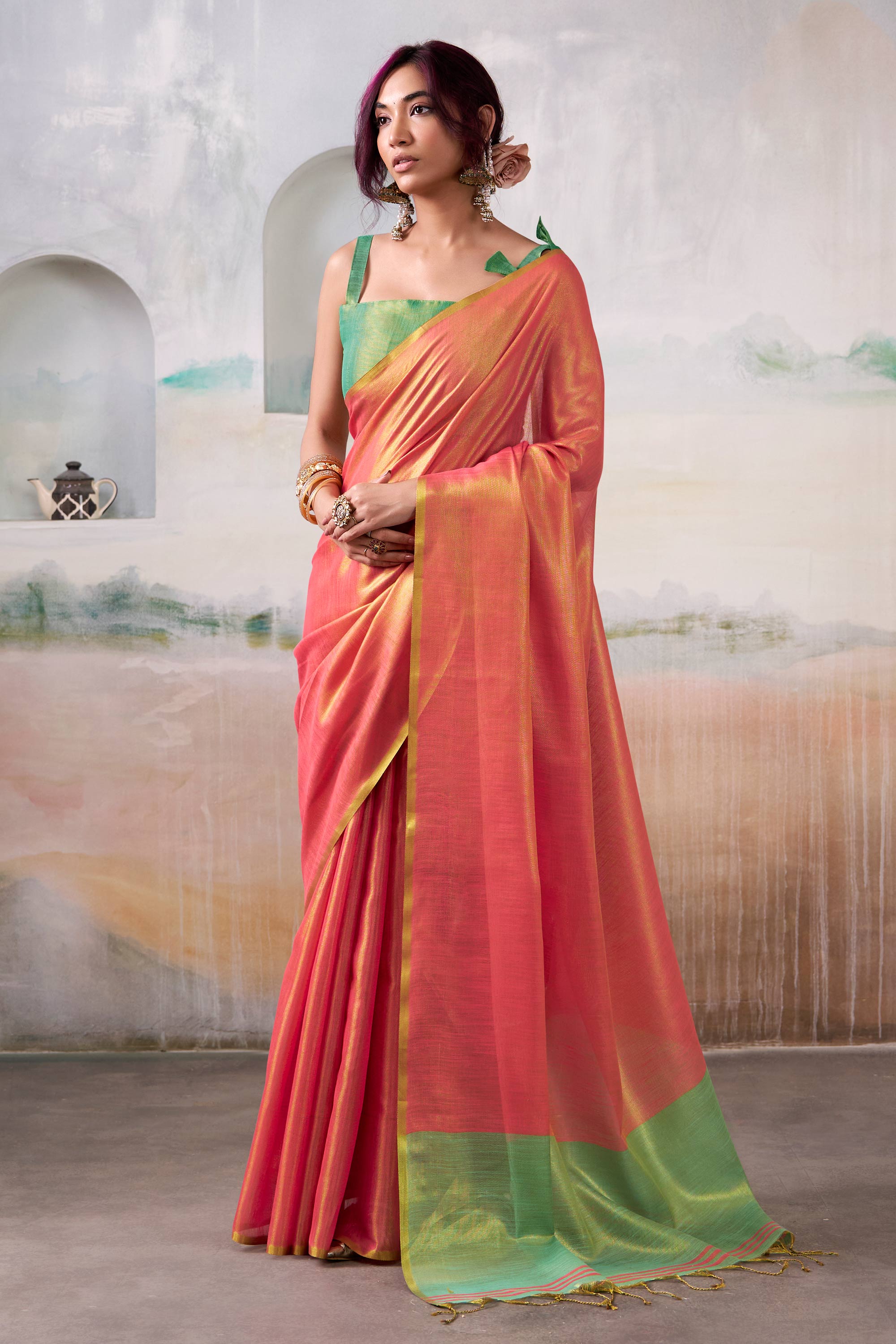 Elevate your festive style with the Festive Wear Elegance Tissue Handloom Saree. Featuring stunning handloom craftsmanship and tissue fabric, this saree balances traditional elegance with contemporary appeal. Its lightweight nature ensures ease of wear, while the subtle shine adds just the right amount of flair. Perfect for weddings, festivals, or cultural gatherings, this saree pairs beautifully with both classic and modern jewelry. The intricate detailing showcases an appreciation for skilled artistry, making it a valued choice for any occasion. Whether for yourself or as a gift, this saree is a must-have for anyone who cherishes heritage and elegance.