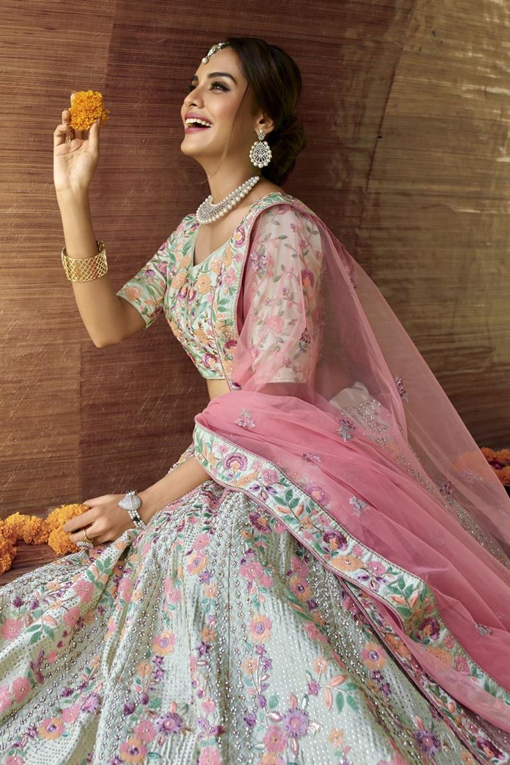 Exclusive Light Cyan Color Sangeet Wear Embroidered Lehenga Choli In Satin Fabric