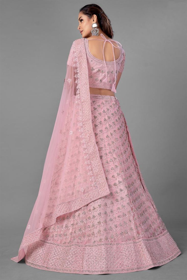 Exclusive Pink Color Net Fabric Thread Embroidered Reception Wear Lehenga Choli