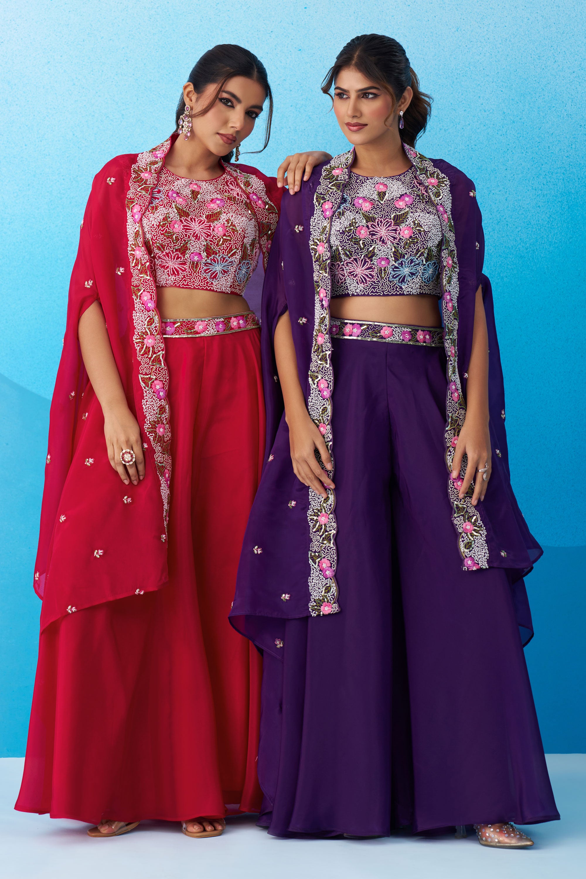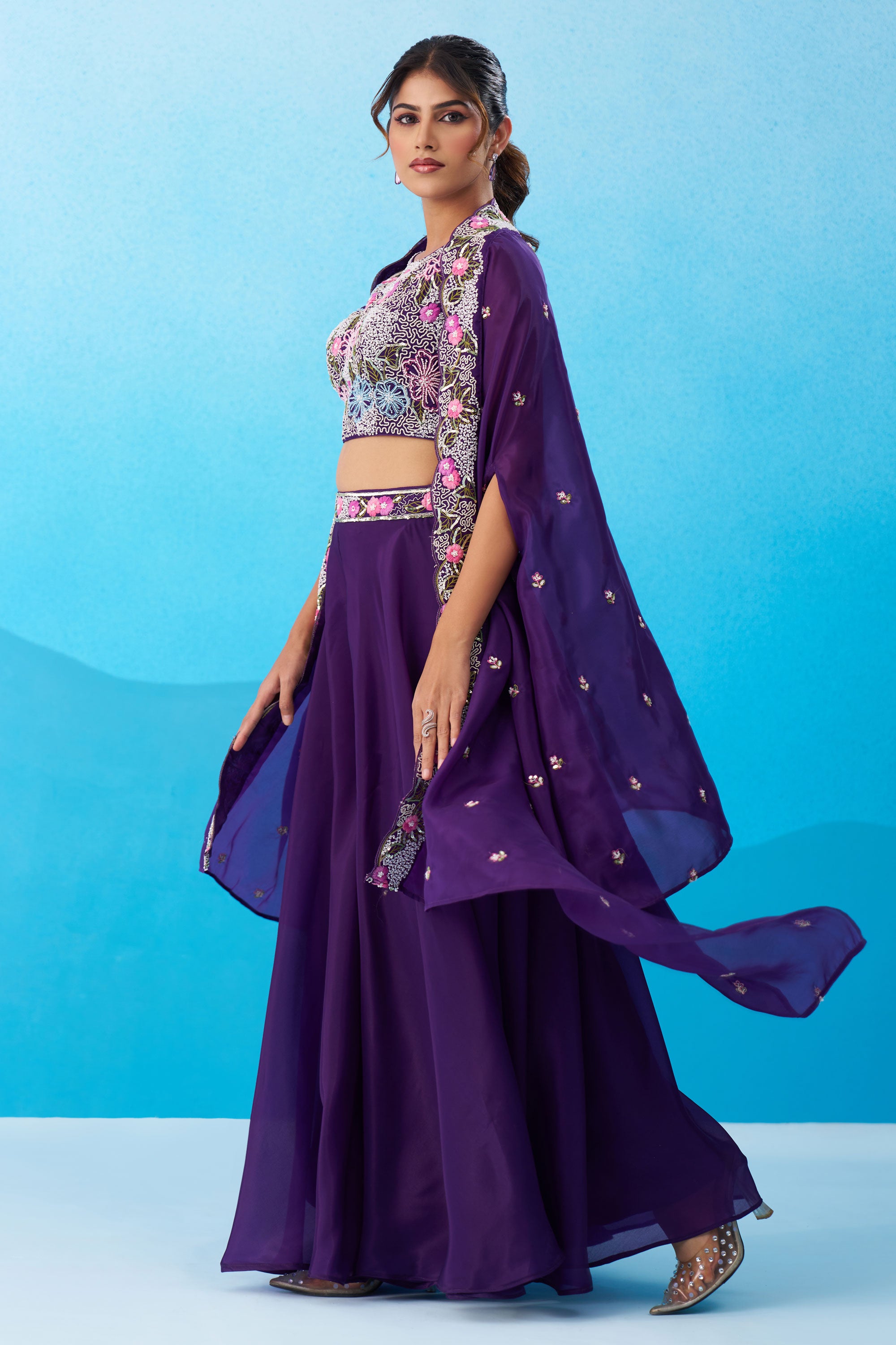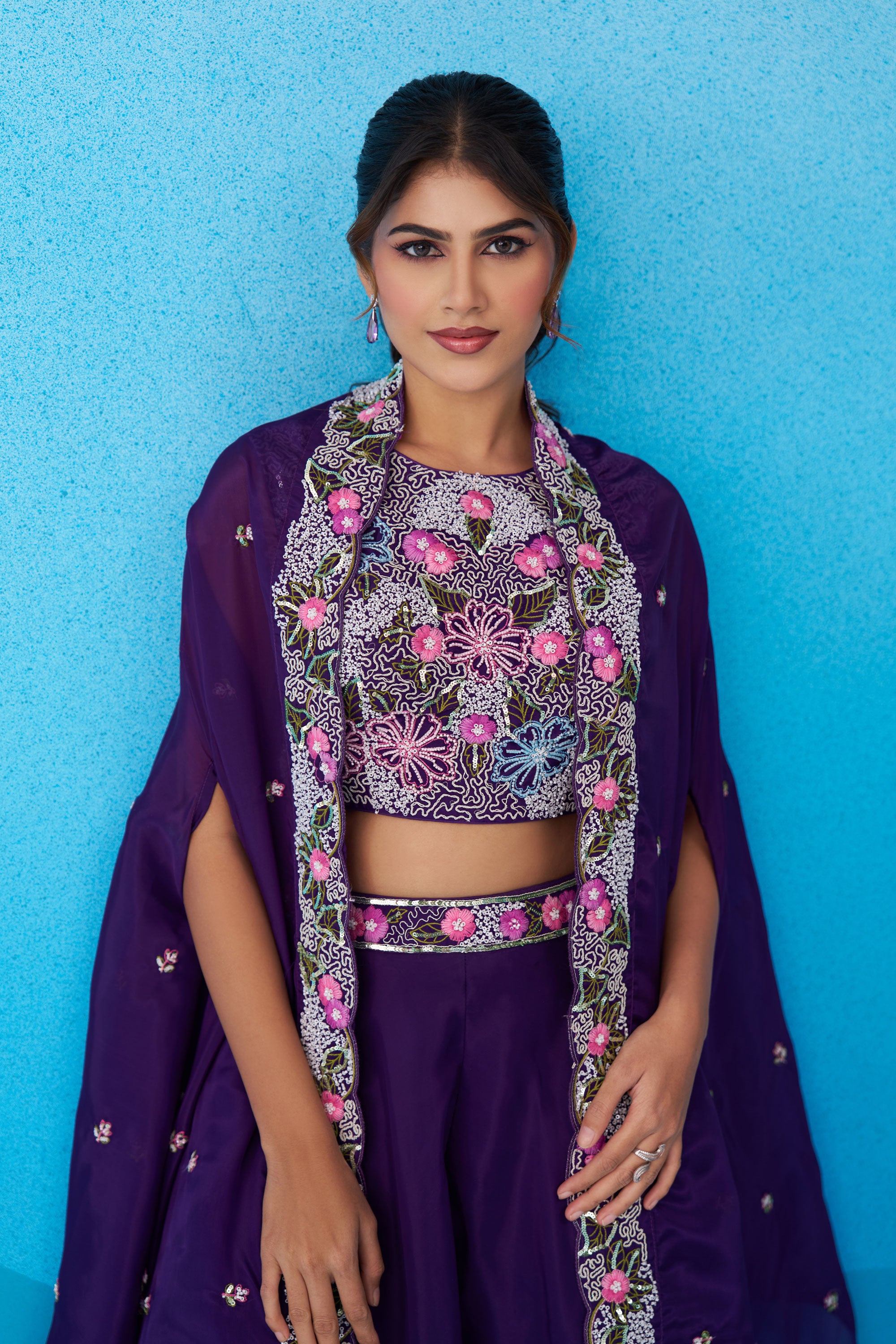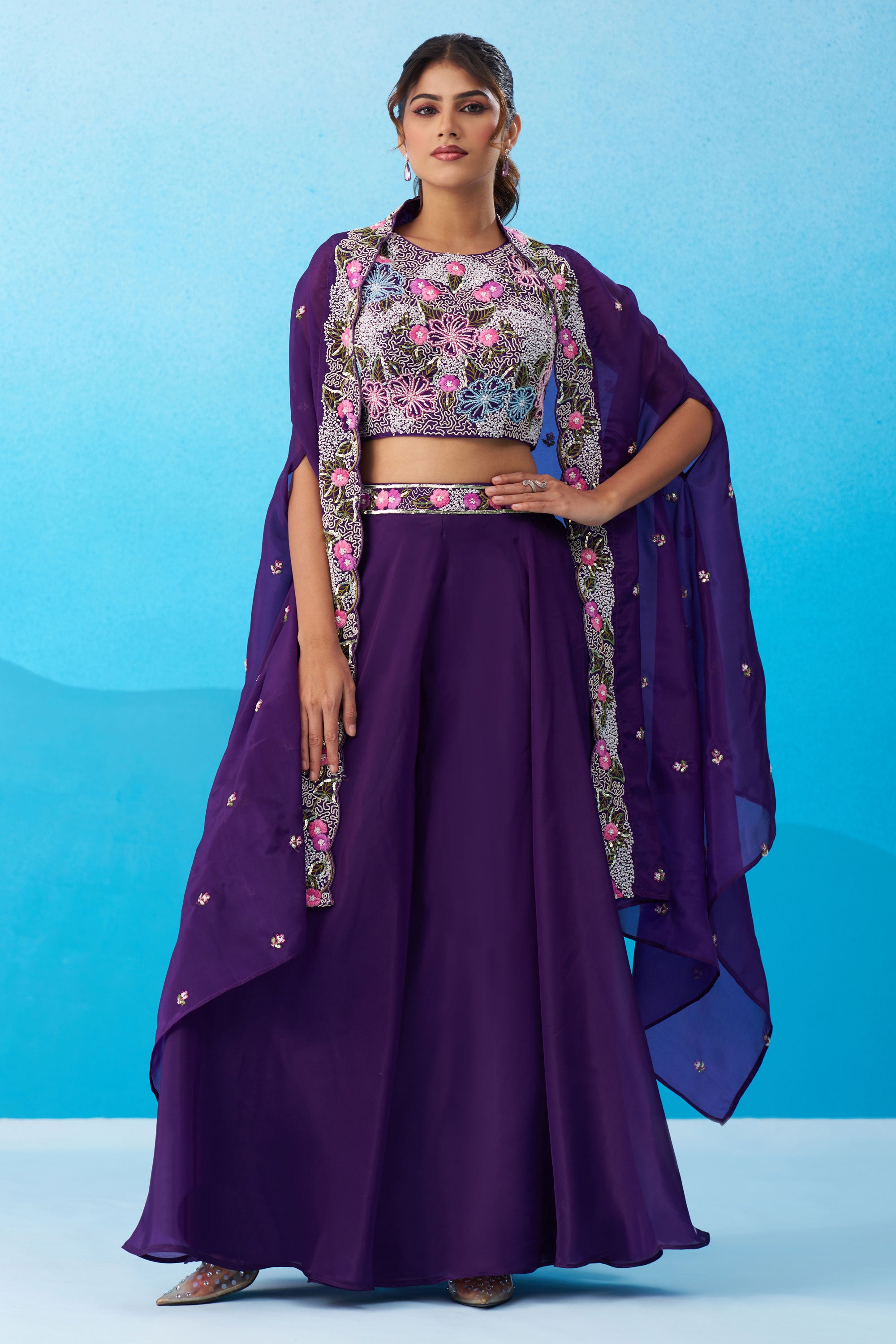 Exclusive Purple Crepe Indo Western Crop Top Palazzo Set With Heavy Embroidery And Cape