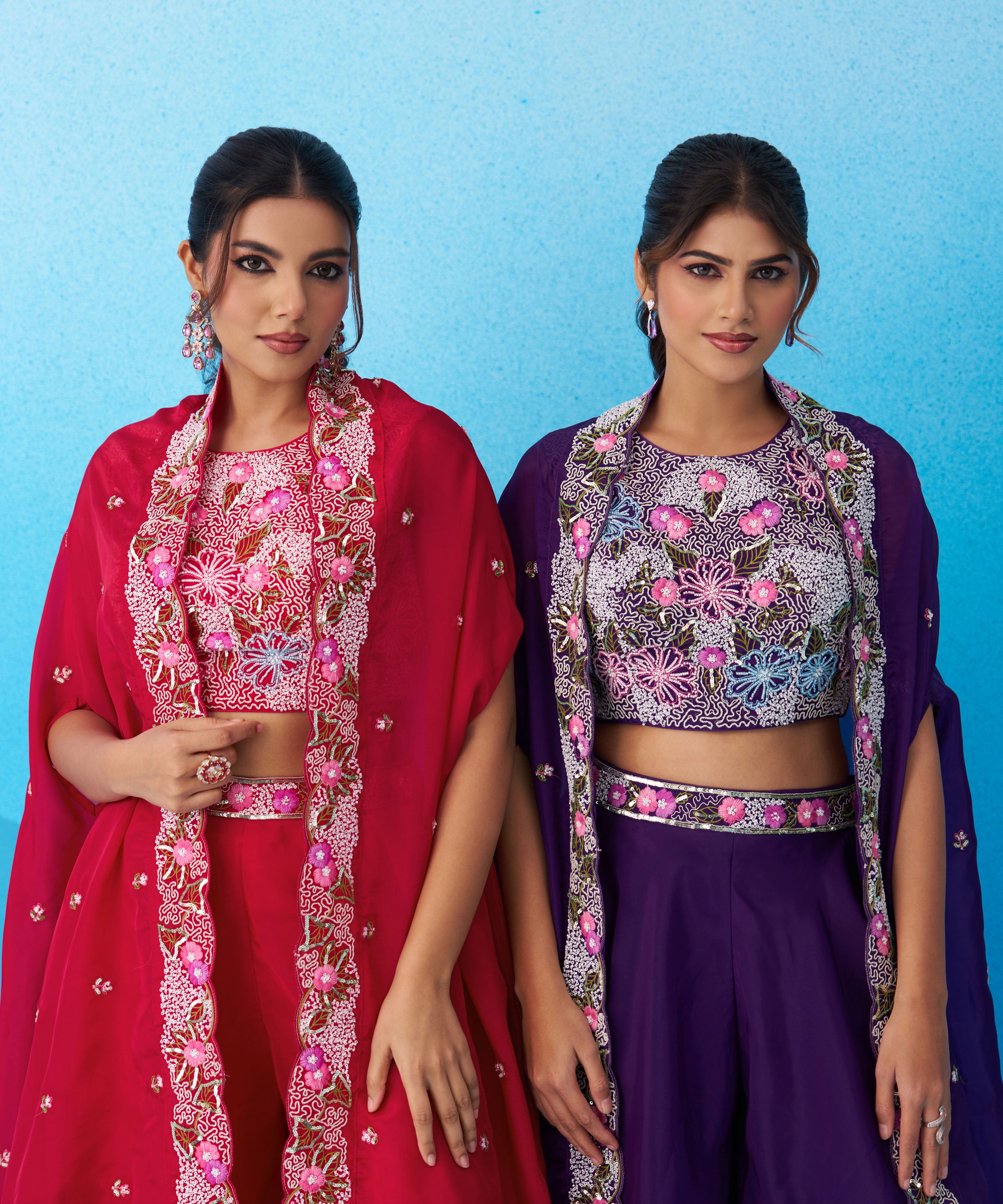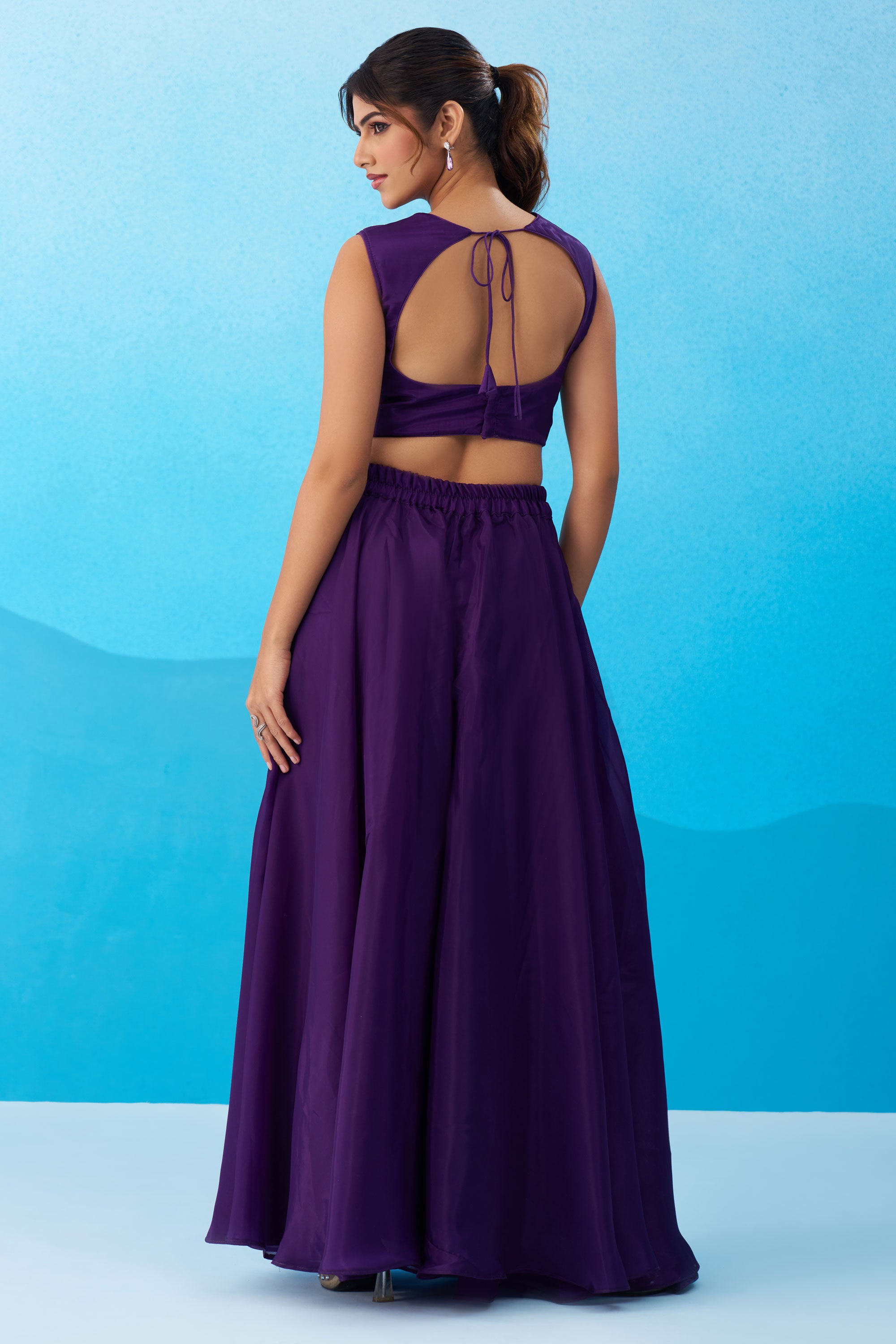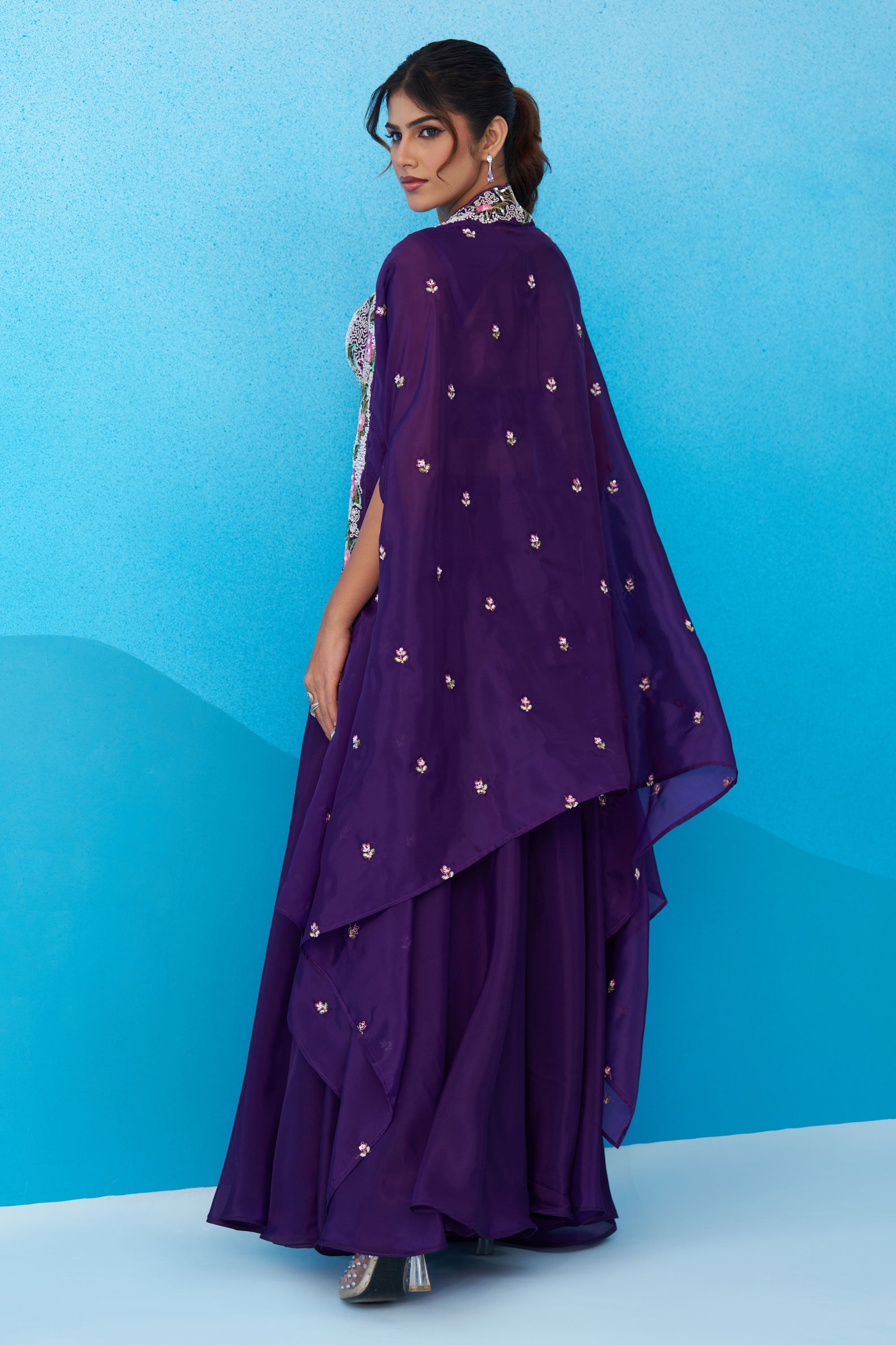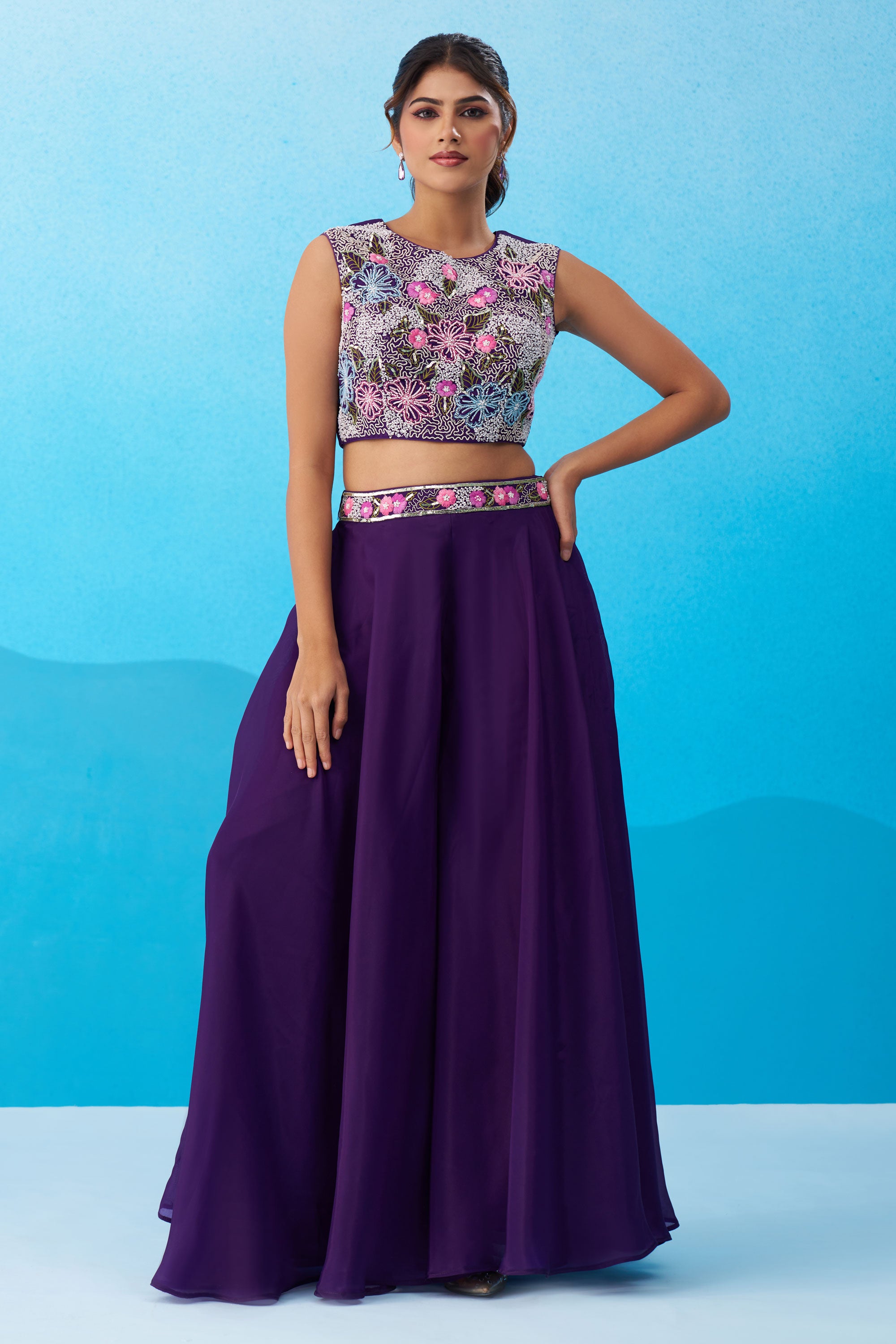 Exclusive Purple Crepe Indo Western Crop Top Palazzo Set With Heavy Embroidery And Cape