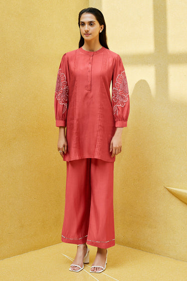 Exclusive Red Floral Embroidery Tunic With Trouser