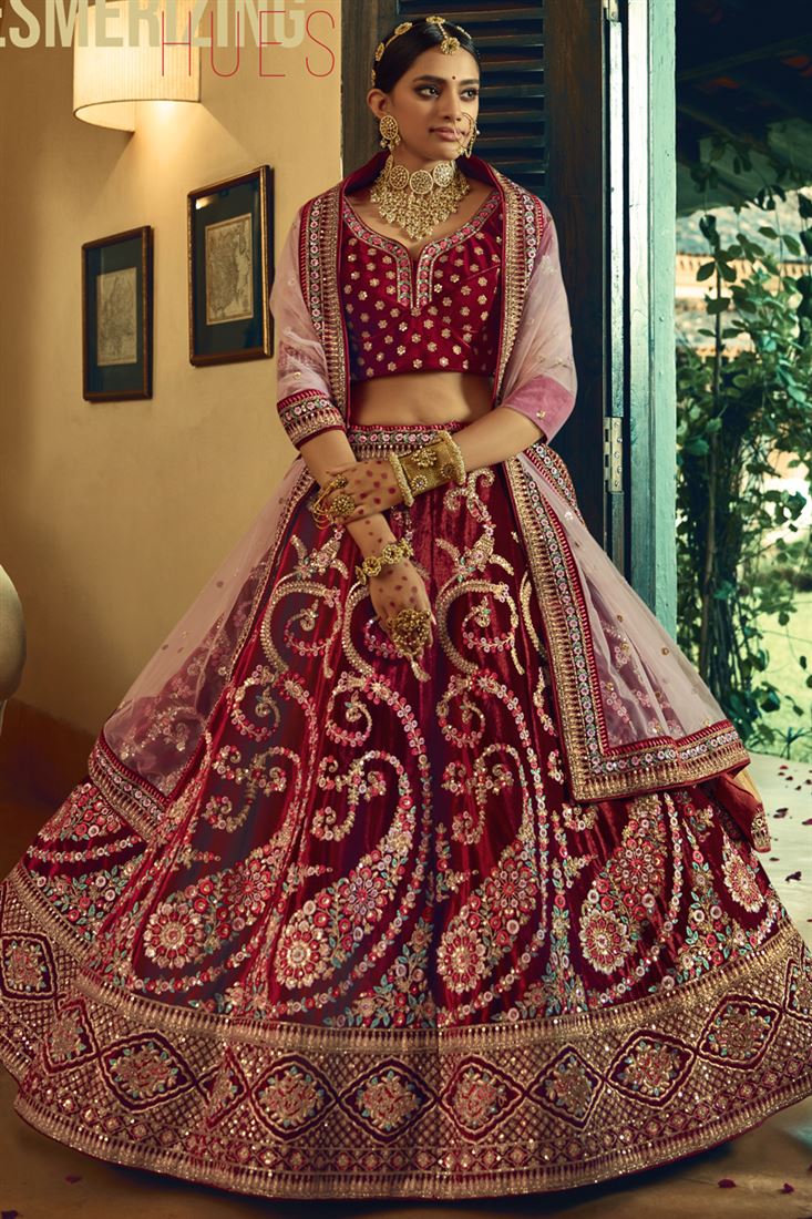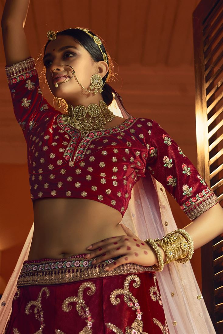 Exclusive Velvet Fabric Embroidered Wedding Wear Designer Lehenga Choli In Maroon Color