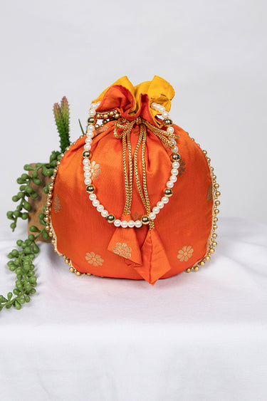 Exquisite Jacquard Work Art Silk Orange Color Potli Bag With Moti Handle