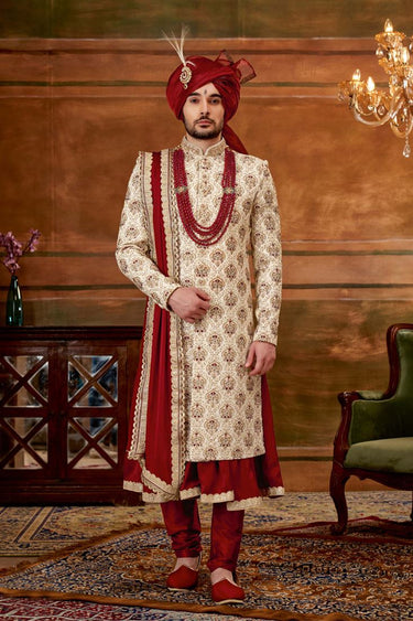 Fancy Beige Color Wedding Wear Readymade Designer Men Heavy Embroidered Groom Sherwani With Stole