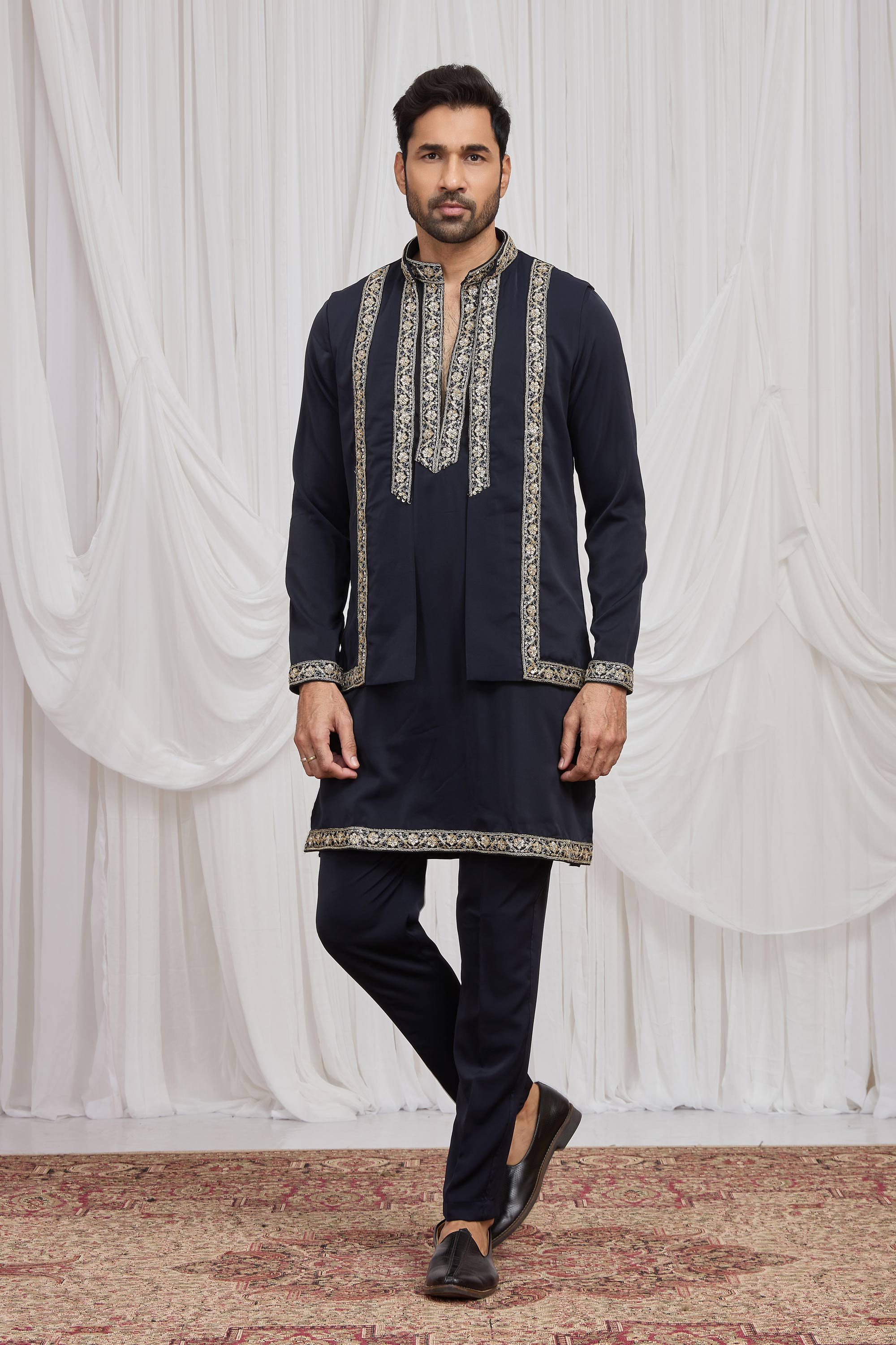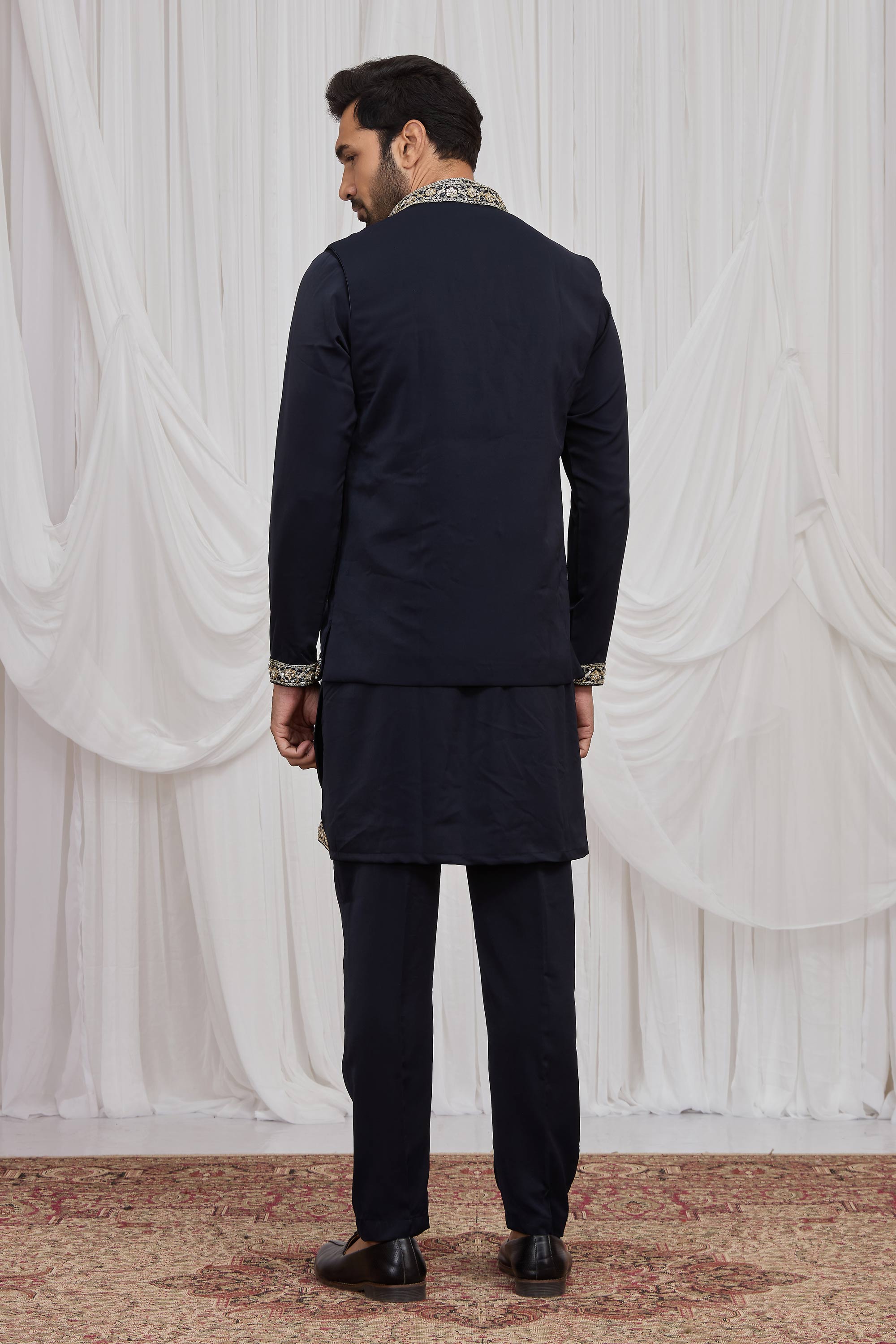 Fancy Fabric Embroidered Navy Blue Readymade Kurta Pyjama With Jacket For Men