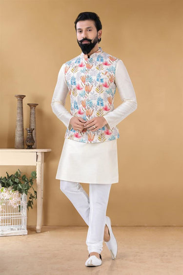 Fascinate Off White Color Art Silk Fabric Reception Wear Trendy Readymade Kurta Pyjama With Jacket