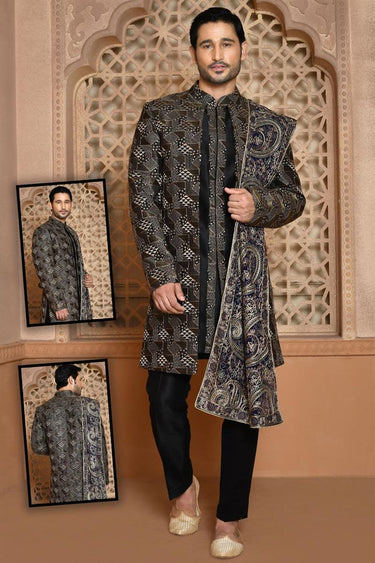 Fascinating Black Color Wedding Wear Banarasi Silk Sherwani