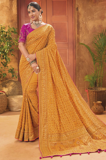 Fashionable Mustard Color Kachhi Work Banarasi Silk Saree