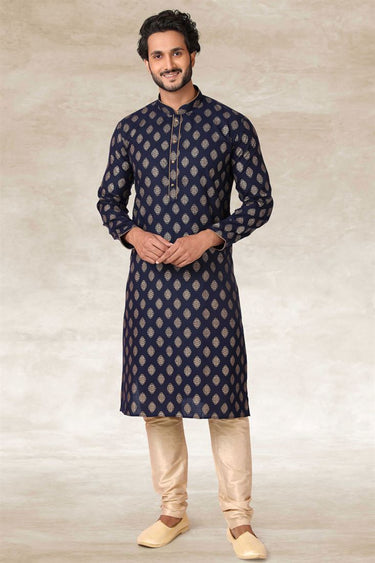 Festival Wear Cotton Fabric Navy Blue Color Stright Kurta Pyjama