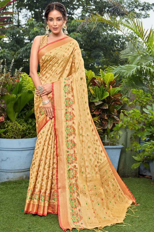 Festival Wear Cotton Silk Fabric Cream Color Weaving Work Luxurious Saree