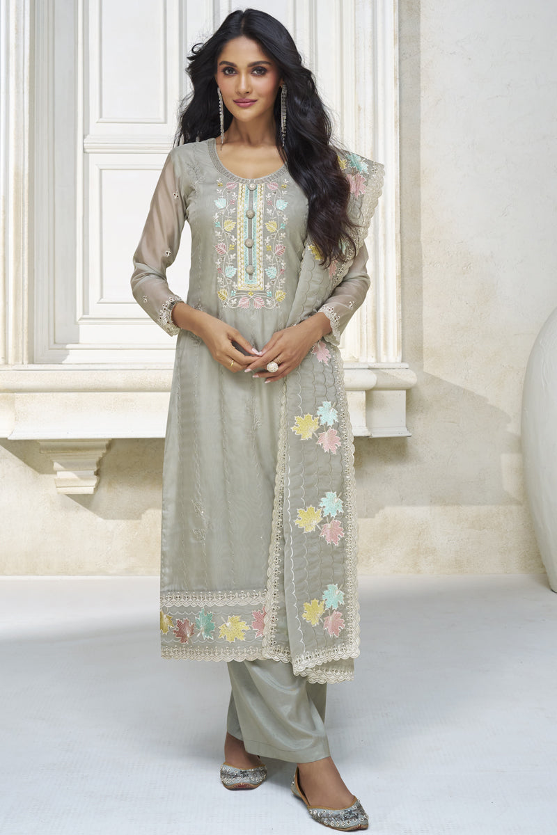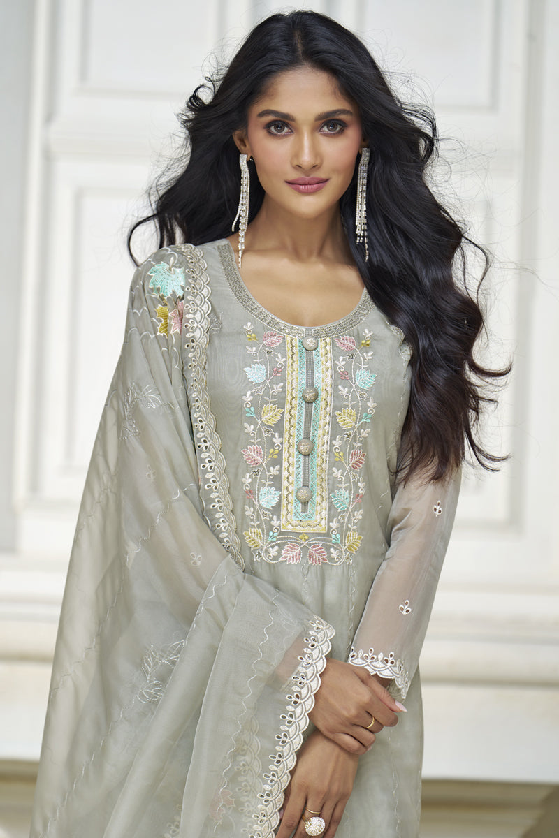 Festive Wear Embroidered Designer Long Straight Cut Salwar Kameez In Organza Silk Fabric Grey Color