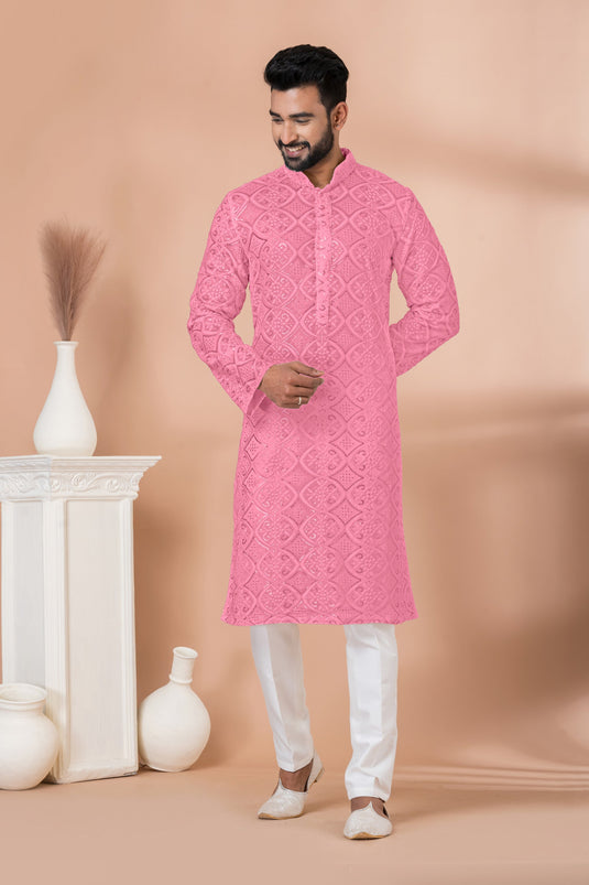 Festive Wear Pink Color Georgette Fabric Readymade Sequins Embroidery Kurta Pyjama For Men