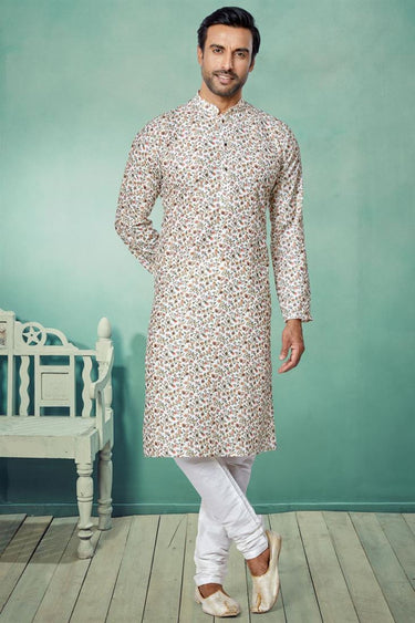 Festive Wear Readymade Printed Kurta Pyjama For Men In Off White Fancy Fabric