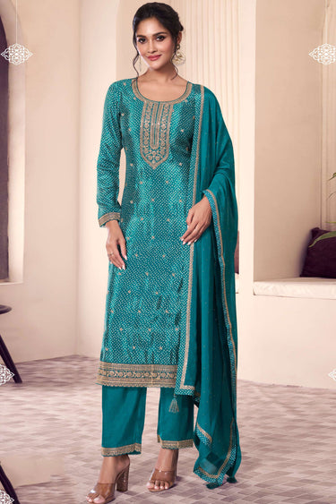 Festive Wear Teal Color Fabulous Salwar Suit In Chinon Fabric