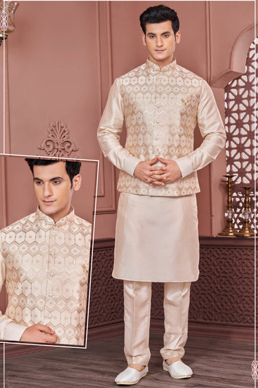 Fetching Beige Banarasi Silk Fabric Sangeet Wear Embroidery Work Readymade Kurta Pyjama For Men With Jacket