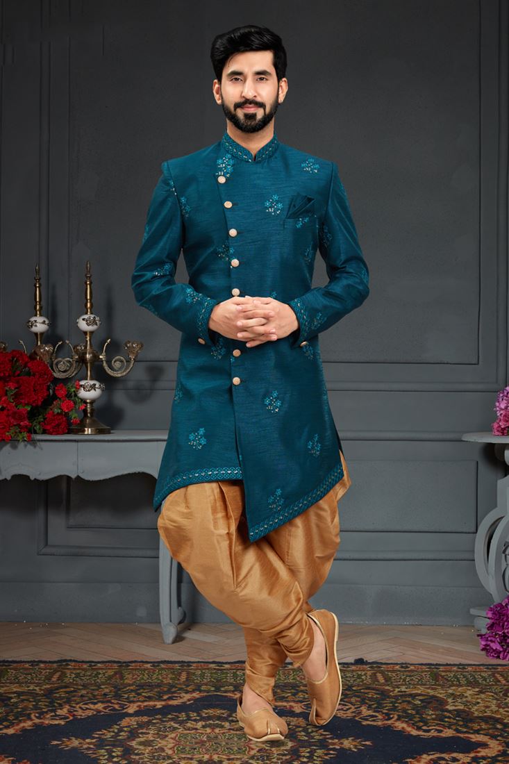 Fetching Teal Silk Fabric Wedding Wear Dhoti Style Indo Western For Men