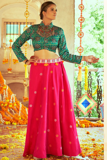 Flamboyant Art Silk Fabric Navratri Special Top Skirt Set In Pink Color