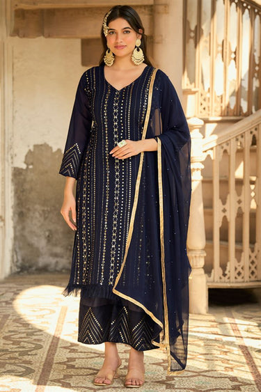 Function Wear Beautiful Georgette Salwar Suit In Navy Blue Color